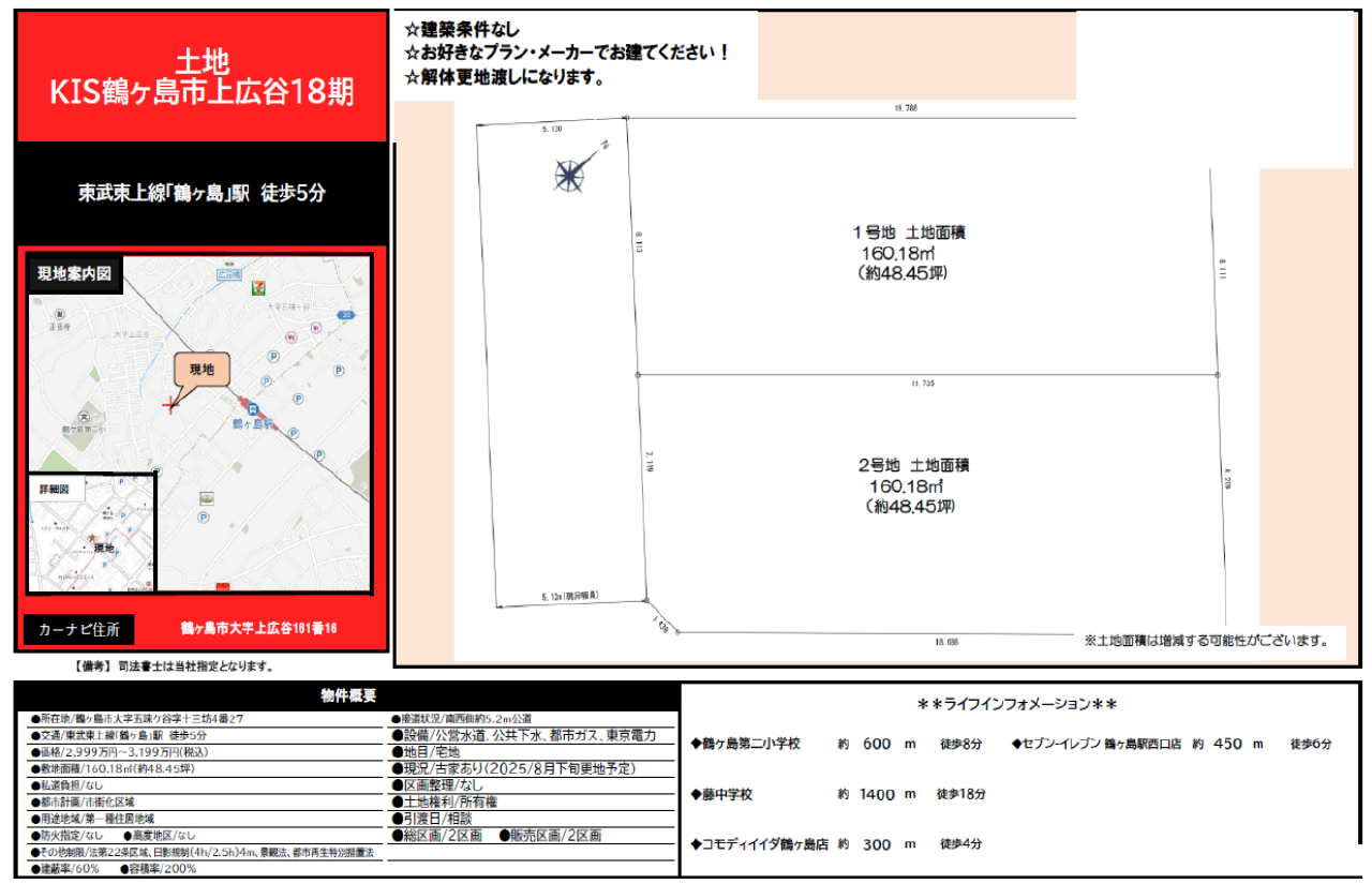 鶴ヶ島市上広谷18期 建築条件無し売地 全2区画
