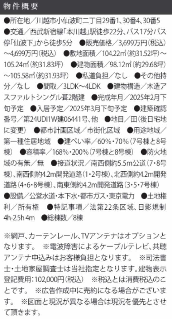【6号棟】 ☆川越市小仙波町2期 新築一戸建て ☆全8棟現場のデザイン住宅! ★新築仲介手数料無料! ☆各階にウォークインクローゼットあり ☆広々使えるLDK ☆おしゃれなアクセントクロス ☆閑静な住宅地 ☆瑕疵担保保険加入物件! ☆住宅性能評価書取得予定物件! ☆フラット35S利用可! ☆駐車場2台 ☆公営水道、本下水、都市ガス ☆川越第一小学校(約950m) ☆川越第一中学校(約1200m) ☆ベルク 川越小仙波店(約500m) ※現地販売業者さんは売主ではございません。 アンケート等の手続きをされますと当社での物件紹介(仲介料手数料無料)が出来なくなります。ご内覧を希望のお客様は当社にて立ち合い・ご案内をさせて頂きますのでお手数ですがTEL049-285-6300までお電話下さい。急いで現地へ向かいますので御連絡お待ちしております。 |