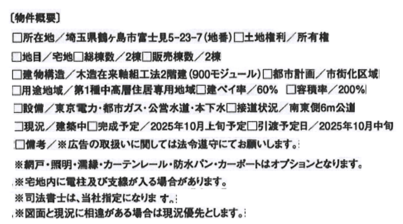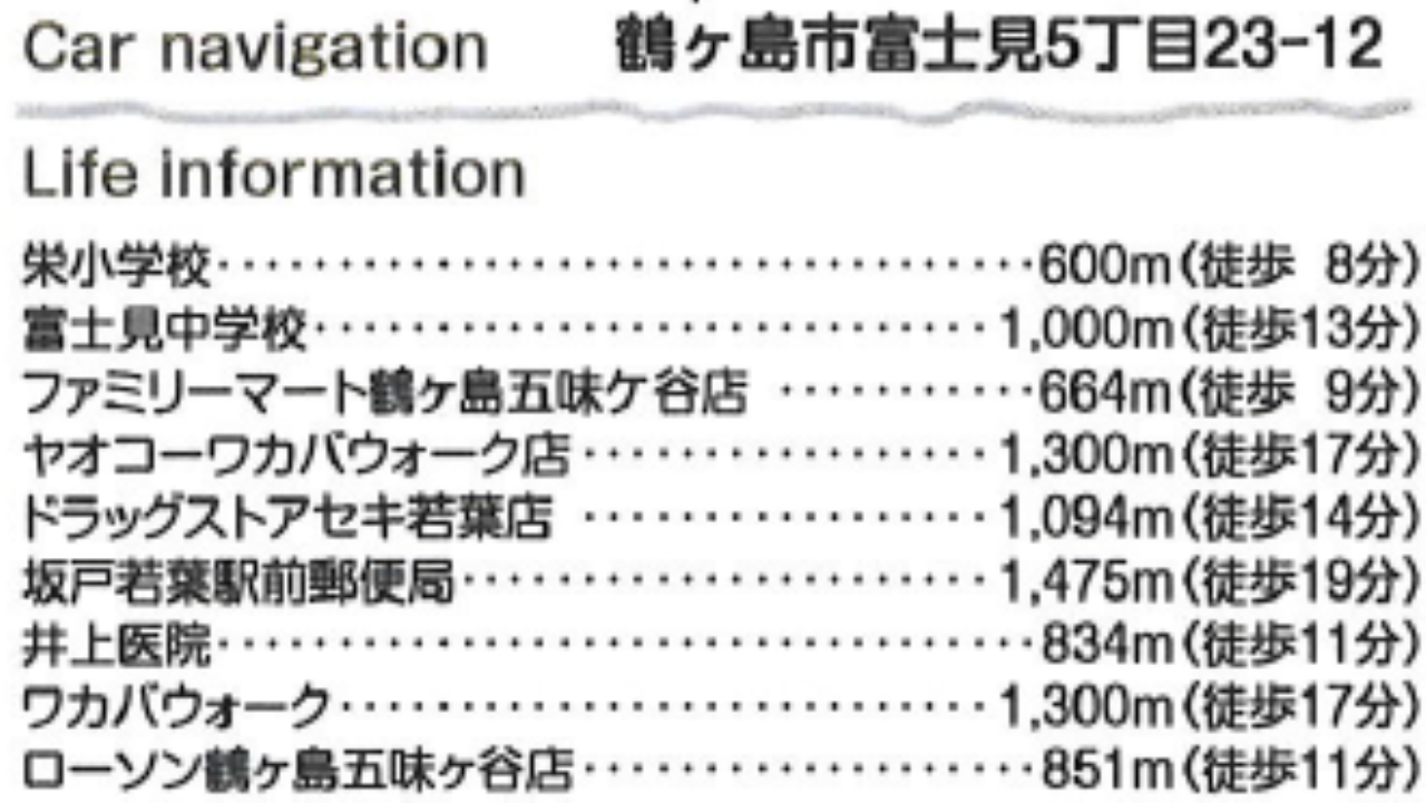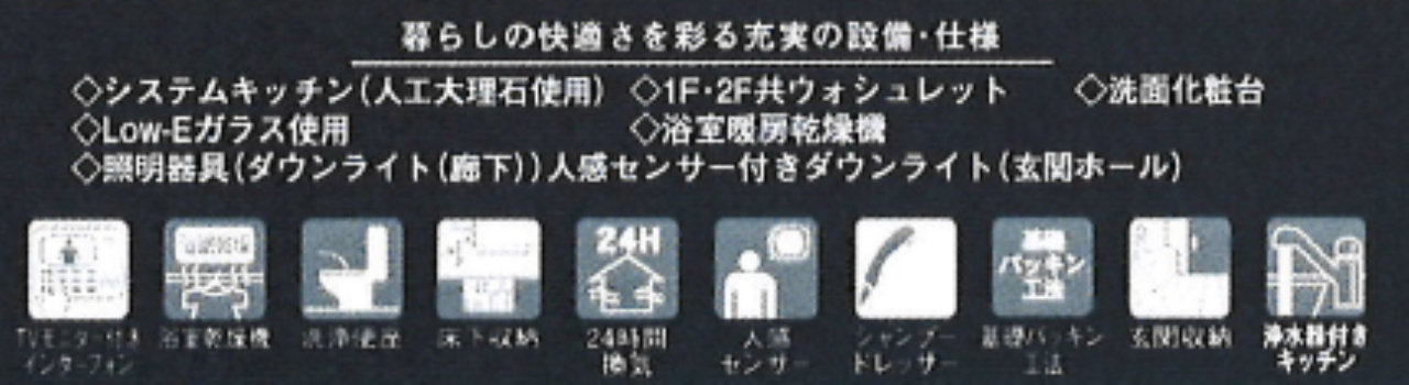 【1号棟】 ☆リーブルガーデン鶴ヶ島市富士見第二 新築一戸建て 全2棟現場 ★新築仲介手数料無料! ☆若葉駅から徒歩20分理想の暮らしを手に入れよう! ☆南東6m道路につき駐車もラクラクです。 ☆駐車場2台 ☆日当り良好! ☆公営水道、本下水、都市ガス ☆道路や区画の整った住宅地! ☆システムキッチン ☆洗浄便座 ☆カウンターキッチン ☆トイレ2ヶ所 ☆全室フローリング ☆火災警報器(報知機) ☆洗面所独立 ☆室内洗濯物干し ☆Wクローゼット ☆床下収納 ☆各室収納スペース ☆省エネ給湯器 ☆24時間換気システム ☆シックハウス対策 ☆長期優良住宅 ☆浴室乾燥機ユニットバス! ☆富士見保育所 距離620m ☆若葉病院 距離1860m ※現地販売業者さんは売主ではございません。 アンケート等の手続きをされますと当社での物件紹介(仲介料手数料無料)が出来なくなります。ご内覧を希望のお客様は当社にて立ち合い・ご案内をさせて頂きますのでお手数ですがTEL049-285-6300までお電話下さい。急いで現地へ向かいますので御連絡お待ちしております。 |