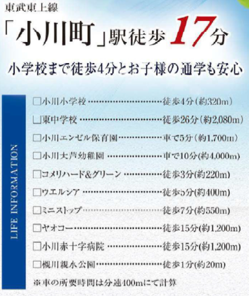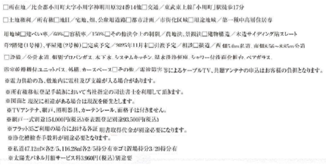 【1号棟】 ☆グラファーレ比企郡小川町小川 新築分譲住宅 全2棟現場 ★新築仲介手数料無料! ☆東武東上線『小川駅』徒歩17分! ☆大容量ウォークインクローゼット ☆主寝室8帖 ☆パントリー+リネン庫採用! ☆人気のシューズインクローク採用! ☆浴室乾燥機ユニットバス! ☆土地面積60坪! ☆ゆとりのある60坪超え! ☆駐車場3台 ☆住宅性能評価書取得! ☆ZEH水準仕様! ☆小川町立小川小学校まで徒歩4分、東中学校まで徒歩26分の通学距離です! ☆公営水道、公共本下水、個別プロパンガス ☆建物最長35年保証・地盤保証20年 ☆住宅性能評価書取得予定物件! ☆フラット35S利用可! ☆「ZEH」とは、Net Zero Energy House(ネット・ゼロ・エネルギー・ハウス)の略語です。建物の断熱性能を高めて、高効率な設備を導入することによって消費するエネルギーを少なくすることで「省エネ」を実現するとともに、太陽光発電などの再生可能エネルギーを創り出す「創エネ」によって、エネルギー収支が正味ゼロになることを目指した住宅のことをいいます。 ☆小川エンゼル保育園…車5分、小川大芦幼稚園…車10分、コメリハード&グリーン…徒歩3分、ウエルシア…徒歩5分、ミニストップ…徒歩7分、ヤオコー…徒歩15分、小川赤十字病院…徒歩15分、槻川親水公園…徒歩1分 ※現地販売業者さんは売主ではございません。アンケート等の手続きをされますと当社での物件紹介(仲介料手数料無料)が出来なくなります。ご内覧を希望のお客様は当社にて立ち合い・ご案約をさせて頂きますのでお手数ですがTEL049-285-6300までお電話下さい。急いで現地へ向かいますので御連絡お待ちしております。 |