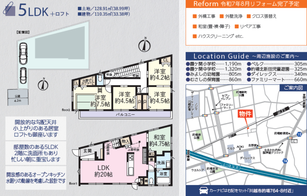 ☆川越市的場 平成27年築の中古住宅 ★仲介手数料無料中古一戸建て! ☆床に無垢材を使用したこだわりの注文住宅! ☆内外装リフォーム令和7年8月リフォーム完了予定! ☆開放的な勾配天井 ☆小上がりのある居室 ☆ロフトも御座います ☆部屋数のある5LDK ☆2階に洗面所もあり忙しい朝に重宝します ☆開放感のあるオープンキッチン ☆水廻りの動線を考慮した設計です ☆公営水道、本下水、オール電化住宅! ☆駐車場2台 |