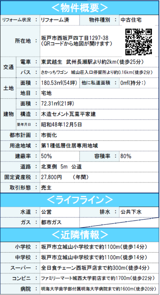 ☆坂戸市西坂戸4丁目 平屋中古戸建て ★仲介手数料無料中古一戸建て! ☆東武越生線『武州長瀬駅』徒歩25分! ☆敷地面積54坪! ☆昭和48年12月築、2SLDKの平屋住宅です! ☆リフォーム済み!(水回り全般、間取り変更、フローリング仕上げ、クロス張替え、クローゼット交換、分電盤交換、給湯器交換、照明交換、インターホン交換、火災報知機設置、防蟻施工) ☆坂戸市立城山小学校、城山中学校まで徒歩14分の通学距離です! ☆駐車場2台! ☆公営水道、本下水、都市ガス ☆全日食チェーン西坂戸店(約300m)、ファミリーマート城西大学前店(約1700m)、明海大学歯学部付属明海大学病院(約1600m) |