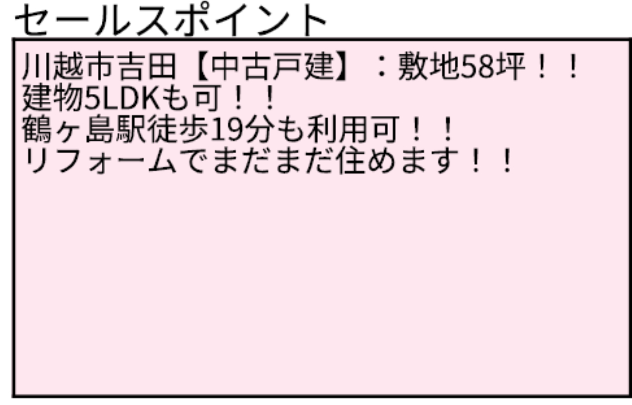 ☆川越市吉田 中古戸建て ☆東武東上線『霞ヶ関駅』徒歩18分! ☆敷地面積58坪! ☆ゆとりのあるお部屋の4LDK! ☆昭和58年9月築! ☆南側にはお庭付き! ☆5LDKとしても使用できます! ☆川越市立名細小学校、名細中学校の通学区です ☆本下水、公営水道 ☆認定こども園霞ヶ関幼稚園(約746m)、エコス川越霞ヶ関店(約576m)、ヤオコー川越霞ヶ関店(約1474m)、ドラッグストアマツモトキヨシ霞ヶ関店(約1273m) |