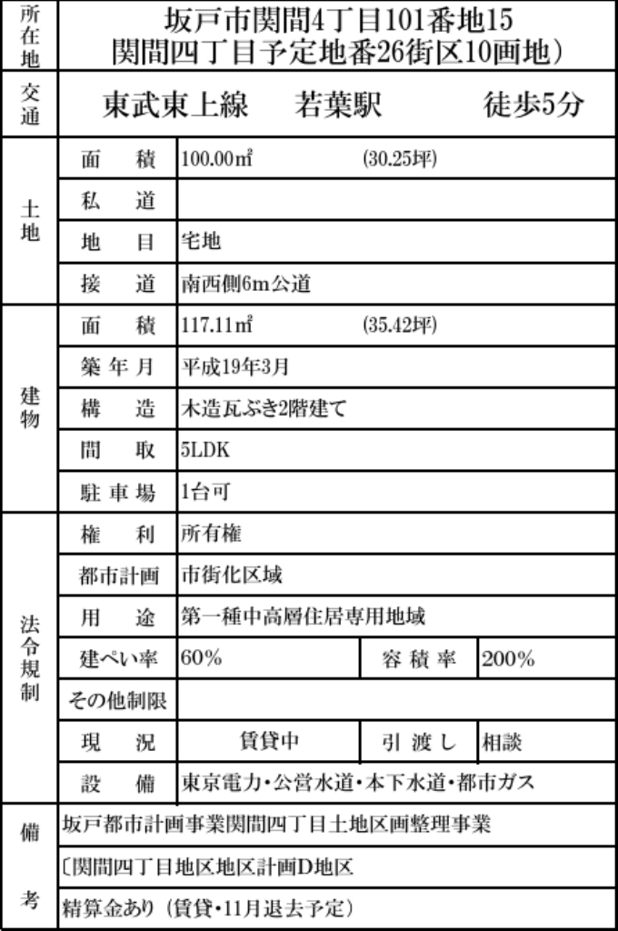 ☆坂戸市関間4丁目床暖房のある家 ☆南6m道路で陽当たり良好! ☆東武東上線『若葉駅』徒歩5分 ☆駐車場、公営水道、本下水、都市ガス ☆日当り良好! ☆南6m道路 ※区画整理完了後精算金徴収あり ※賃貸・11月退去予定 |