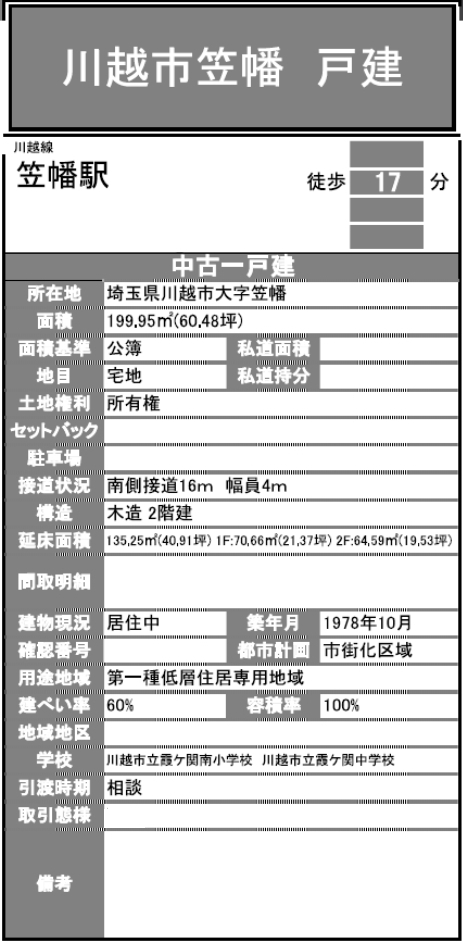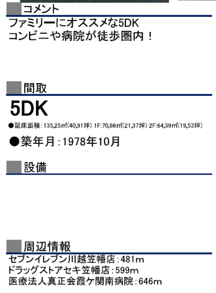 ☆川越市笠幡 中古戸建て ☆JR川越線『笠幡駅』徒歩17分! ☆敷地面積60坪! ☆昭和53年10月築、5DK中古住宅! ☆閑静な住宅街! ☆部屋数が多いので家族が多くても快適に過ごせる住まい! ☆駐車場1台! ☆川越市立霞ヶ関南小学校、霞ヶ関中学校の通学区です ☆公営水道 ☆セブンイレブン川越笠幡店(約481m)、ドラッグストアセキ笠幡店(約599m)、医療法人真正会霞ヶ関南病院(約646m) |