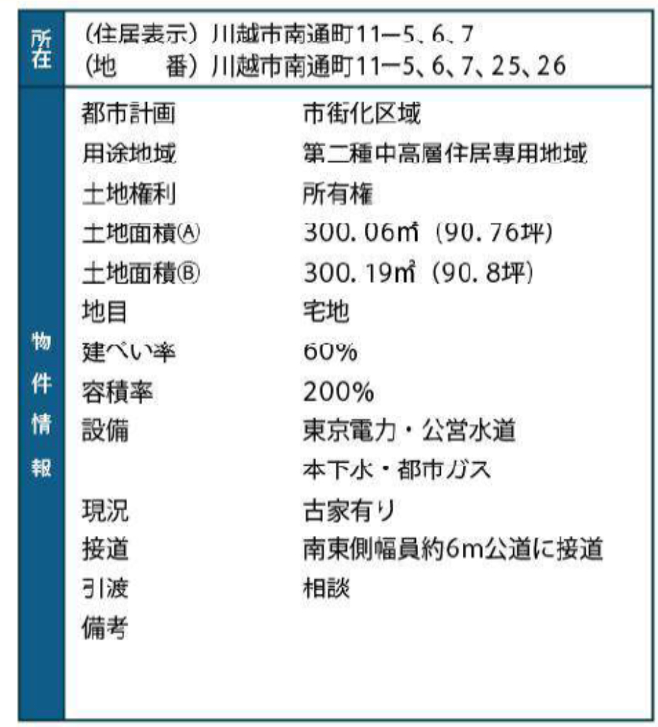 ★仲介手数料無料土地! ☆土地面積181坪! ☆建築条件無し! ☆南東道路6m! ☆分割での販売も可能!(A区画・B区画それぞれ90坪!) ☆川越市立仙波小学校まで徒歩9分、第一中学校まで徒歩8分! ☆公営水道、公共本下水、都市ガス ☆どなたでも建築できる土地です!(34条11号適用含む) |