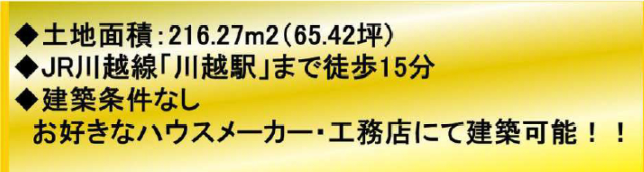 ☆土地面積65坪! ☆建築条件無し! ☆即日引き渡し可能! ☆川越市立仙波小学校、第一中学校の通学区 ☆公営水道、本下水、個別プロパンガス ☆どなたでも建築できる土地です!(34条11号適用含む) |
