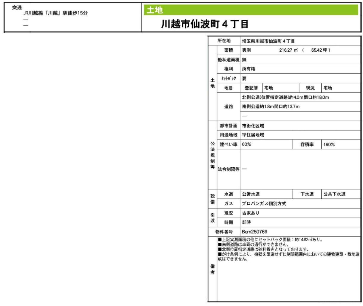 ☆川越市仙波町4丁目 建築条件無し売地 ☆東武東上線『川越駅』徒歩15分! ☆土地面積65坪! ☆建築条件はありません。お好きなハウスメーカーで建築できます! ☆古家あり。即日引渡し! ☆ゆとりのある広さの土地! ☆川越市立仙波小学校、第一中学校の通学区です ☆公営水道、本下水、個別プロパンガス ☆どなたでも建築できる土地です!(34条11号適用含む) |