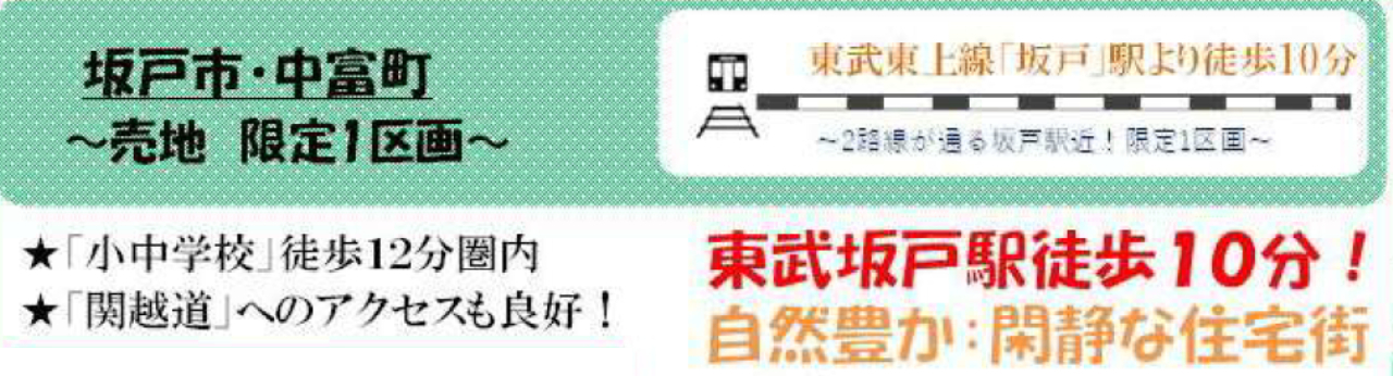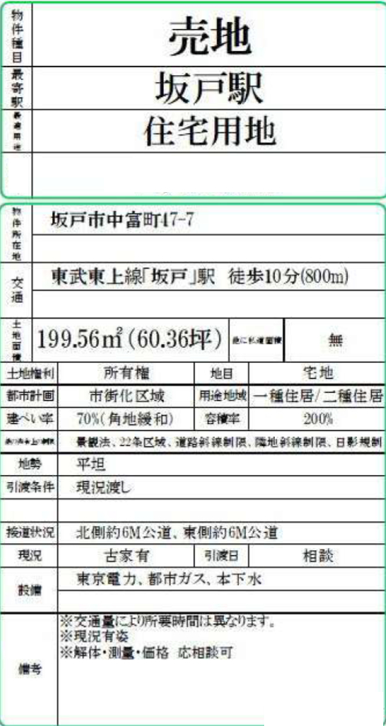 ☆坂戸市中富町 建築条件無し売地! ☆東武東上線『坂戸駅』徒歩10分! ☆敷地面積60坪! ☆建築条件はありません。お好きなハウスメーjカーで建築できます! ☆閑静な住宅街! ☆駅まで徒歩10分、通勤通学に便利な好立地! ☆北東角地・前面道路6mにつき開放感あり! ☆坂戸市立浅羽野小学校まで徒歩12分、浅羽野中学校まで徒歩9分の通学距離です! ☆公営水道、公共本下水、都市ガス ☆どなたでも建築できる土地です!(34条11号適用含む) ☆坂戸幼稚園…徒歩11分、坂戸カオル幼稚園…徒歩11分、ファミリーマート…徒歩6分、セイムス…徒歩1分、セイユウ…徒歩4分、アクロスプラザ坂戸…徒歩10分、西込遊公園…徒歩1分、幡戸公園…徒歩6分 |