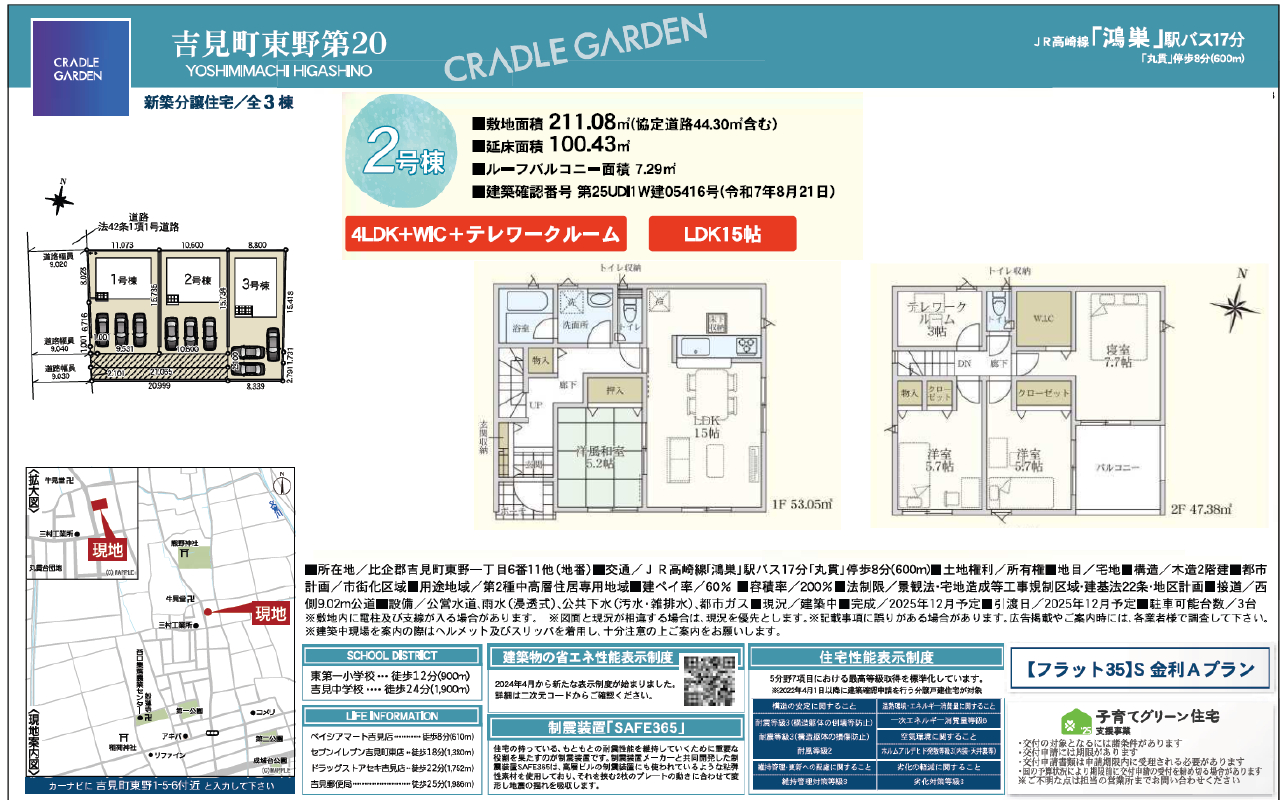 【2号棟】 ☆クレイドルガーン比企郡吉見町東野第20 新築一戸建て 全3棟現場 ★仲介手数料無料新築一戸建て! ☆東武東上線『東松山駅』バス18分、バス停『丸貫』停歩10分! ☆敷地面積63坪! ☆お部屋全体が見渡せる対面キッチン付きのリビング! ☆3帖のテレワークルームあり! ☆駐車場3台! ☆吉見町立第一小学校、吉見中学校の通学区です ☆瑕疵担保保険加入物件! ☆住宅性能評価書取得予定物件! ☆フラット35S利用可! ☆子育てグリーン住宅支援事業対象! ☆公営水道、本下水、都市ガス ☆ベイシアマート吉見店…徒歩8分、セブンイレブン吉見町東店…徒歩16分、ドラッグストアセキ吉見店…徒歩22分、吉見郵便局…徒歩25分 ※現地販売業者さんは売主ではございません。アンケート等の手続きをされますと当社での物件紹介(仲介料手数料無料)が出来なくなります。ご内覧を希望のお客様は当社にて立ち合い・ご案約をさせて頂きますのでお手数ですがTEL049-285-6300までお電話下さい。急いで現地へ向かいますので御連絡お待ちしております。 |
