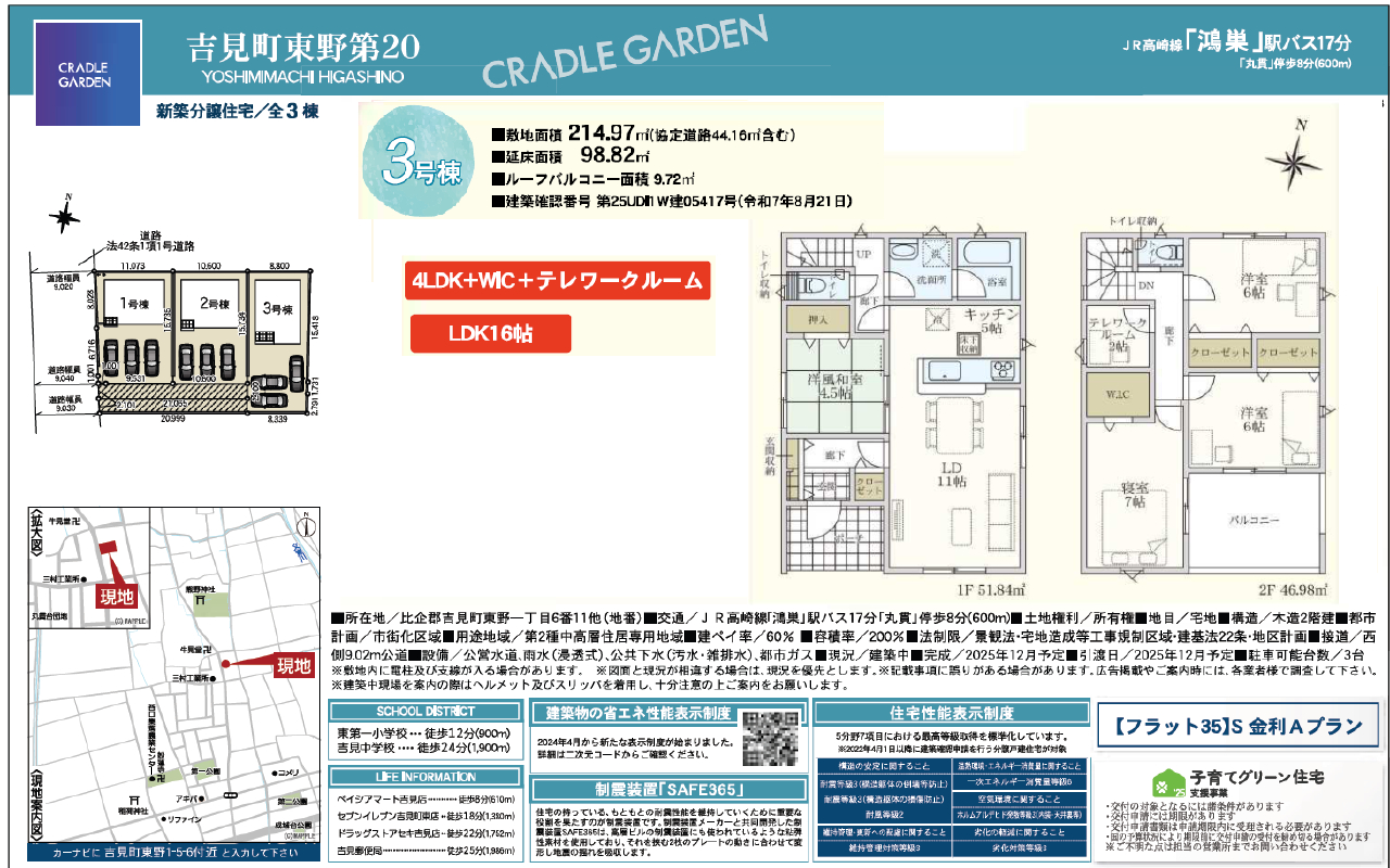 【3号棟】 ☆クレイドルガーン比企郡吉見町東野第20 新築一戸建て 全3棟現場 ★仲介手数料無料新築一戸建て! ☆東武東上線『東松山駅』バス18分、バス停『丸貫』停歩10分! ☆敷地面積65坪! ☆お部屋全体が見渡せる対面キッチン付きのリビング! ☆2帖のテレワークルームあり! ☆駐車場3台! ☆吉見町立第一小学校、吉見中学校の通学区です ☆瑕疵担保保険加入物件! ☆住宅性能評価書取得予定物件! ☆フラット35S利用可! ☆子育てグリーン住宅支援事業対象! ☆公営水道、本下水、都市ガス ☆ベイシアマート吉見店…徒歩8分、セブンイレブン吉見町東店…徒歩16分、ドラッグストアセキ吉見店…徒歩22分、吉見郵便局…徒歩25分 ※現地販売業者さんは売主ではございません。アンケート等の手続きをされますと当社での物件紹介(仲介料手数料無料)が出来なくなります。ご内覧を希望のお客様は当社にて立ち合い・ご案約をさせて頂きますのでお手数ですがTEL049-285-6300までお電話下さい。急いで現地へ向かいますので御連絡お待ちしております。 |