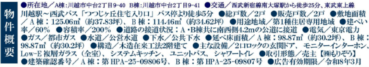 【A号棟】 ☆川越市中台2丁目 新築一戸建て 全2棟現場 ★仲介手数料無料新築一戸建て! ☆フラット35S利用可! ☆長期優良住宅 ☆駐車場2台、公営水道、本下水、都市ガス ☆浴室乾燥機ユニットバス!★仲介手数料無料新築一戸建て! ☆フラット35S利用可! ☆駐車場2台、公営水道、本下水、都市ガス ☆浴室乾燥機ユニットバス! ※現地販売業者さんは売主ではございません。アンケート等の手続きをされますと当社での物件紹介(仲介料手数料無料)が出来なくなります。ご内覧を希望のお客様は当社にて立ち合い・ご案約をさせて頂きますのでお手数ですがTEL049-285-6300までお電話下さい。急いで現地へ向かいますので御連絡お待ちしております。 |