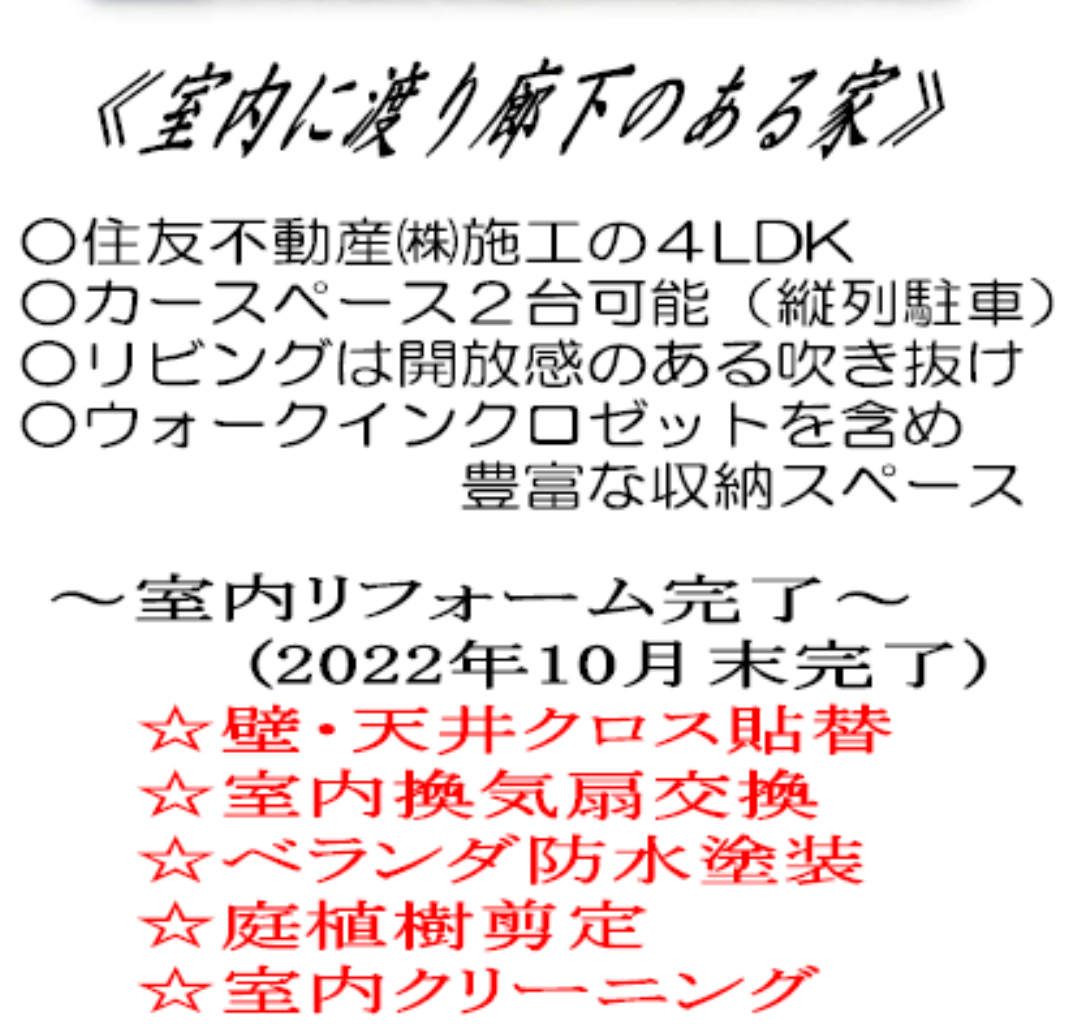 ☆比企郡滑川町月の輪1丁目 中古一戸建て ☆東武東上線『つきのわ駅』徒歩6分! ☆敷地面積59坪! ☆平成16年9月築、5LDK中古住宅! ☆南・東・北の3方面道路に面していて開放感あり! ☆住友不動産施工! ☆リビングは開放感のある吹き抜けの造り! ☆全室南向き! ☆2022年10月リフォーム済!(壁・天井クロス張替え、室内換気扇交換、ベランダ防水塗装、庭植樹剪定、室内クリーニング) ☆滑川町立月の輪小学校、滑川中学校の通学区です ☆駐車場2台! ☆公営水道、本下水、集中プロパンガス |