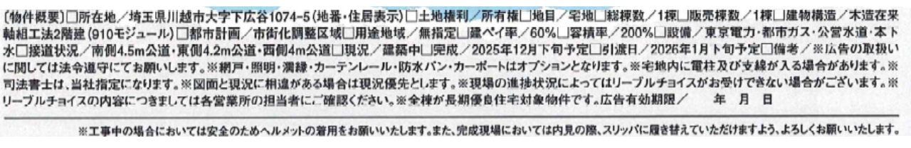 ☆川越市下広谷 新築一戸建て ★新築仲介手数料無料0円! ☆東武東上線『鶴ヶ島駅』徒歩14分! ☆敷地面積57坪! ☆ワンフロアタイプで開放感があるリビングには対面キッチンあり! ☆南・東・西の3方面道路! ☆TVモニター付きインターホン、浴室乾燥機、洗浄便座、24時間換気システム、人感センサー、シャンプードレッサー、浄水器などの設備です! ☆駐車場2台! ☆川越市立広谷小学校まで徒歩17分、名細中学校まで徒歩12分の通学距離です! ☆瑕疵担保保険加入物件! ☆住宅性能評価書取得! ☆フラット35S利用可! ☆子育てグリーン住宅支援事業対象物件! ☆省エネBELS! ☆公営水道、本下水、都市ガス ☆ファミリーマート川越天沼店(約920m)、TAIRAYA上広谷店(約825m)、埼玉りそな銀行鶴ヶ島支店(約1001m)、鶴ヶ島駅前郵便局(約923m)、川鶴クリニック(約314m)、セイジョー五味ヶ谷店(約333m)、ダイソー鶴ヶ島店(約651m) ※現地販売業者さんは売主ではございません。 アンケート等の手続きをされますと当社での物件紹介(仲介料手数料無料)が出来なくなります。ご内覧を希望のお客様は当社にて立ち合い・ご案内をさせて頂きますのでお手数ですがTEL049-285-6300までお電話下さい。急いで現地へ向かいますので御連絡お待ちしております。(^o^) |