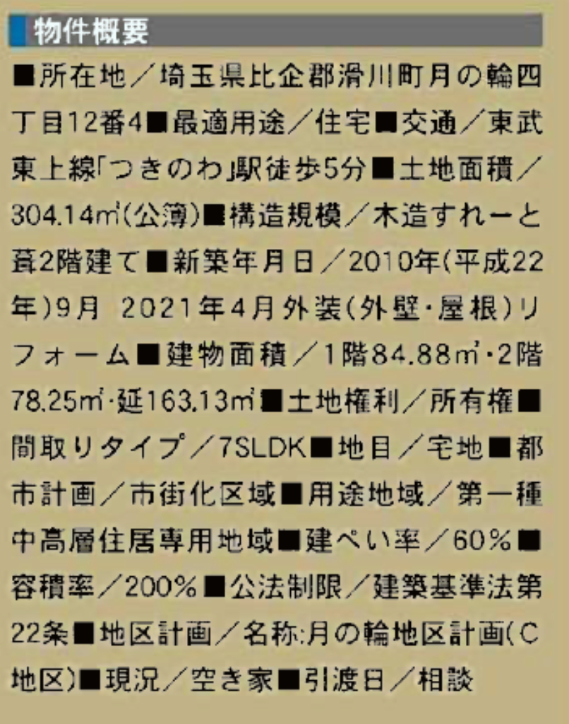 ☆比企郡滑川町月の輪4丁目 中古一戸建て ☆東武東上線『つきのわ駅』徒歩5分! ☆敷地面積92坪! ☆部屋数の多い7SLDK中古戸建て! ☆住友不動線施工の2×4工法! ☆火を使わないオール電化! ☆南道路につき陽当たり良好! ☆区画整理されたきれいな街並み! ☆広い敷地で駐車スペースも4台可! ☆きれいな建物です! ☆滑川町立月の輪小学校、滑川中学校の通学区です ☆公営水道、本下水、都市ガス ☆ヤオコーつきのわ駅前店(約1536m)、ドラッグストアセキつきのわ店(約550m)、セブンイレブンつきのわ駅北店(約612m)、ローソン東松山バイパス店(約990m)、桑の木保育園(約1650m)、業務スーパー嵐山店(約2578m)、DCMつきのわ駅前店(約1359m)、ウエルシア滑川つきのわ店(約643m)、埼玉県滑川総合高校(約255m)、滑川月輪簡易郵便局(約1569m) |