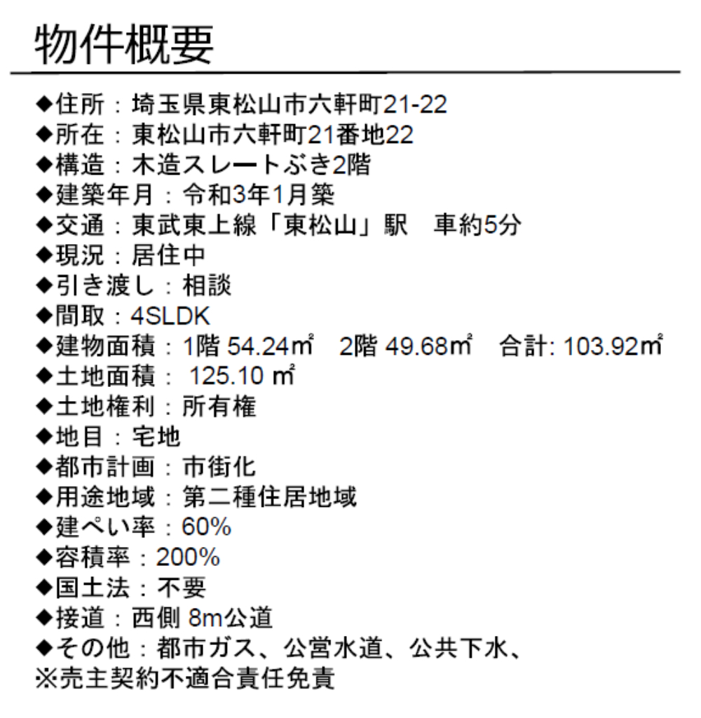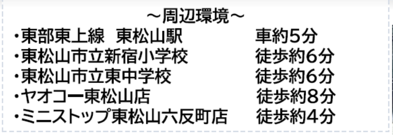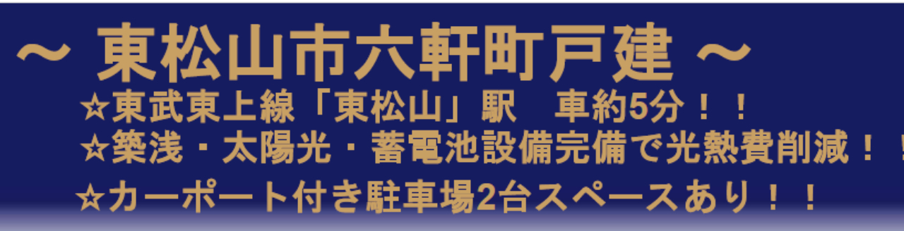 ☆東松山市六軒町 中古一戸建て ☆東武東上線『東松山駅』車5分! ☆敷地面積37坪! ☆令和3年1月築、4SLDK中古住宅! ☆太陽光発電・蓄電池完備で災害時にも安心! ☆駐車場2台! ☆広々したリビングには対面キッチンやリビングイン階段あり! ☆東松山市立新宿小学校、東中学校まで徒歩6分の通学距離です! ☆公営水道、本下水、都市ガス ☆ヤオコー東松山店…徒歩8分、ミニストップ東松山六反町店…徒歩4分 |