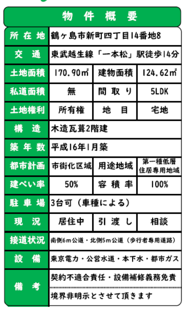☆鶴ヶ島市新町4丁目 中古戸建て ☆東武生越線『一本松駅』徒歩14分! ☆敷地面積51坪! ☆平成16年1月築、5LDK中古住宅です! ☆南・北の両面道路! ☆陽当り良好です! ☆1階は広々したリビングと独立した8帖の和室! ☆部屋数の多い5LDK! ☆鶴ヶ島市立新町小学校まで徒歩2分、西中学校まで徒歩12分の通学距離です! ☆駐車場3台! ☆公営水道、本下水、都市ガス ☆大家幼稚園(約1100m)、あたご保育園(約110m)ヤオコー一本松南店(約160m)、ローソン鶴ヶ島上新田店(約810m)、坂戸市大家出張所(約630m)、こだわりの家 |