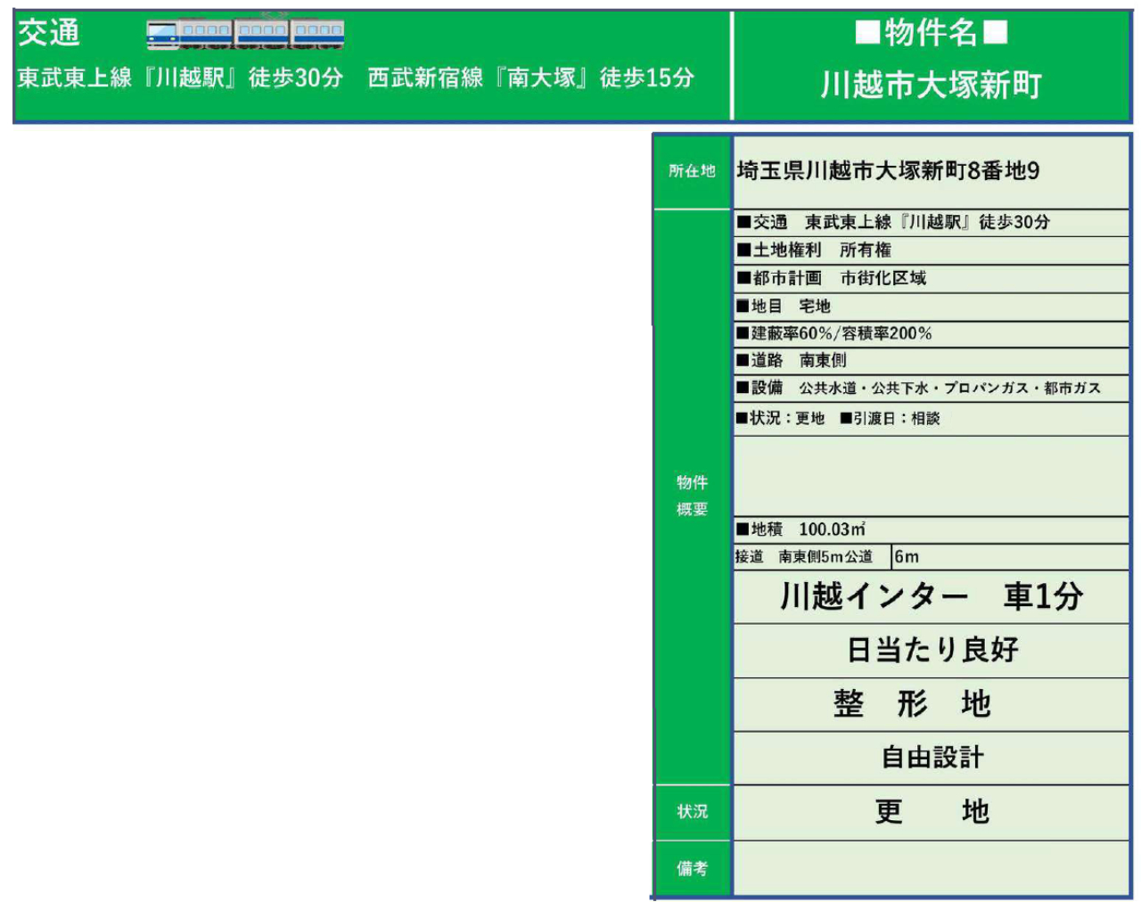 ☆川越市大塚新町 建築条件無し売地! ★仲介手数料無料土地! ☆東武東上線『川越駅』徒歩30分! ☆西武新宿線『南大塚駅』徒歩15分! ☆土地面積30坪! ☆南道路! ☆陽当たり良好です! ☆建築条件はありません。お好きなハウスメーカーで建築できます! ☆川越市立武蔵野小学校まで徒歩12分、大東中学校まで徒歩20分の通学距離です! ☆公営水道、公共本下水、プロパンガス ☆どなたでも建築できる土地です!(34条11号適用含む) ☆南二葉幼稚園…徒歩15分、貴精保育園…徒歩9分、ベルクむさし野店…徒歩10分、ファミリーマート南大塚店…徒歩12分、ありやまクリニック…徒歩9分、飯能信用金庫南大塚支店…徒歩15分 |