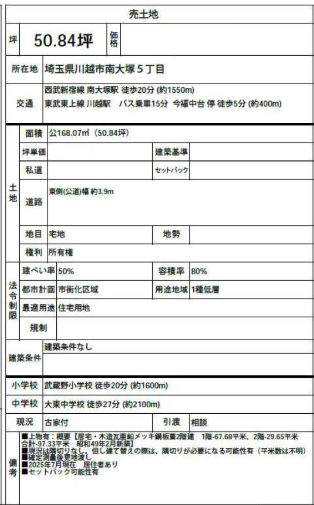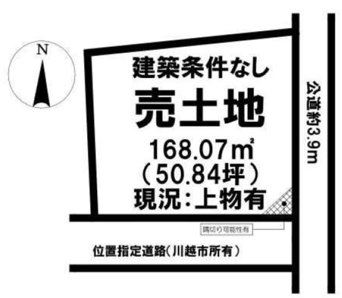 ☆敷地面積50坪! ☆建築条件無し! ☆南×東道路に面した角地! ☆陽当たり良好! ☆川越市立武蔵野小学校、大東中学校の通学区 ☆公営水道、公共本下水 ☆どなたでも建築できる土地です!(34条11号適用含む) |