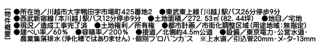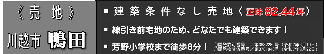 ★仲介手数料無料土地! ☆土地面積82坪! ☆建築条件無し ☆陽当たり良好! ☆川越市立芳野小学校、芳野中学校の通学区です ☆公営水道、個別プロパンガス、農業集落排水 ☆どなたでも建築できる土地です!(34条11号適用含む) |