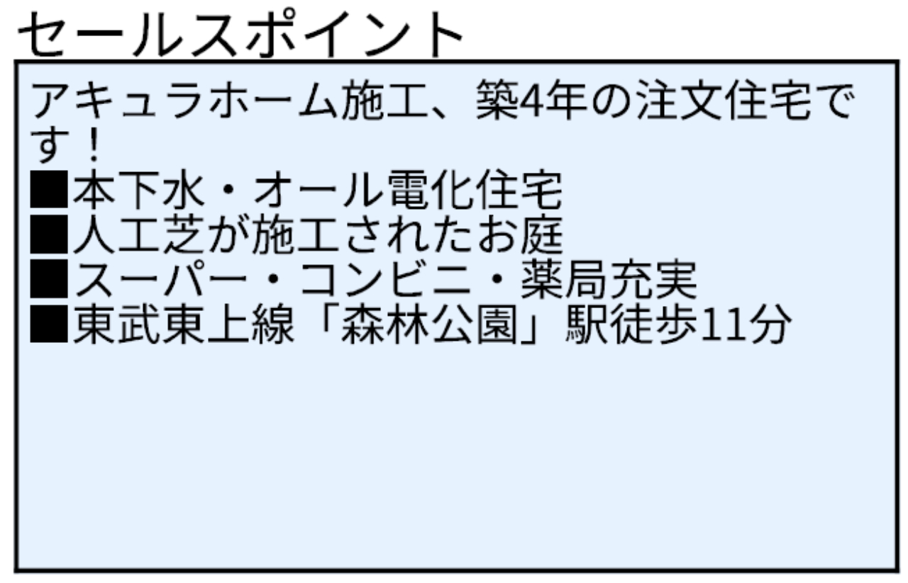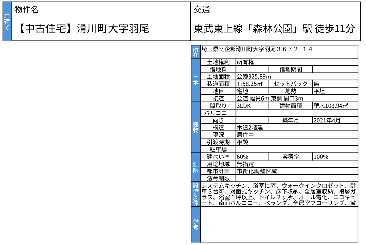 ☆比企郡滑川町羽尾 中古戸建て ☆東武東上線『森林公園駅』徒歩11分! ☆敷地面積98坪! ☆令和3年4月築、築4年の3LDK! ☆アキュラホーム施工の注文住宅! ☆火を使わないオール電化! ☆玄関土間収納やクローゼットなど収納が豊富な家! ☆お庭は人工芝できれいに整備されています! ☆システムキッチン、浴室乾燥機、IHクッキングヒーター、食器洗浄乾燥機、浄水器、エコキュート、ペアガラスなどの設備です! ☆駐車場3台! ☆滑川町立宮前小学校、滑川中学校の通学区です ☆公営水道、本下水、オール電化 ☆第二みどり保育園(約1186m)、徳樹庵東松山店(約898m)、マクドナルド東松山インター店(約1319m)、ヤオコー東松山シルピア店(約729m)、MEGAドン・キホーテ東松山店(約1085m)、ファミリーマート東松山石橋店(約1142m)、ドラッグストアセキ松葉町店(約1125m)  |