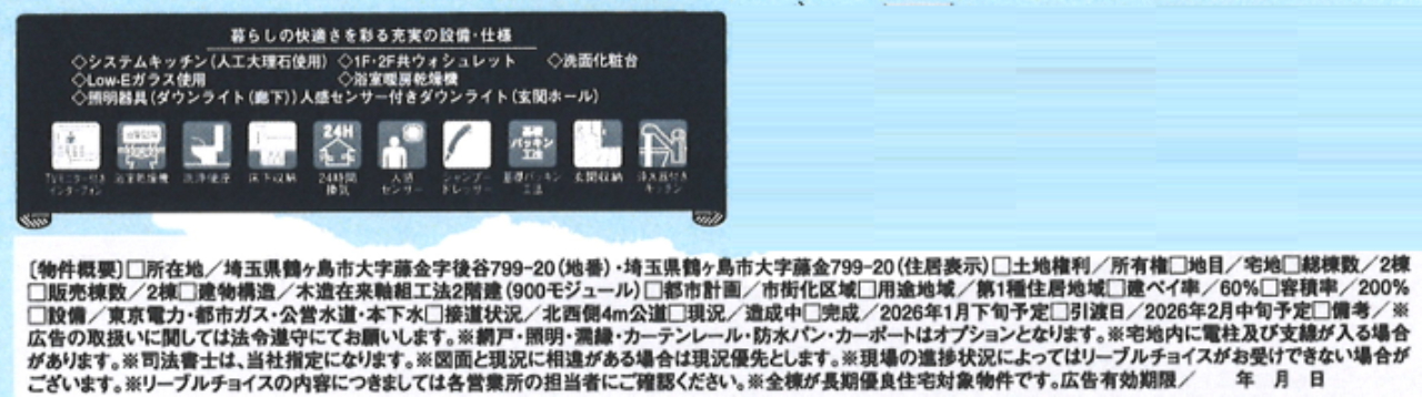 【1号棟】 ☆鶴ヶ島市藤金 新築一戸建て 全2棟 ★仲介手数料無料土地! ☆東武東上線『若葉駅』徒歩13分! ☆住宅性能評価書取得予定物件! ☆アパート用地にも最適! ☆鶴ヶ島市立藤小学校まで徒歩8分 ☆藤中学校まで徒歩9分 ☆駐車場2台 ☆公営水道、公共本下水、都市ガス ☆ワカバウォーク…徒歩17分 ☆セブンイレブン鶴ヶ島市役所通り店…徒歩4分 ☆ヤオコー若葉駅西口店…徒歩13分 |