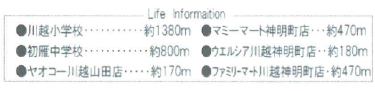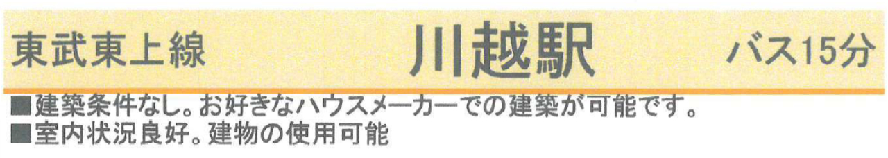 ☆川越市神明町 平屋中古戸建て ★仲介手数料無料中古一戸建て! ☆東武東上線『川越駅』bさう15分、バス停『神明町車庫』停歩1分! ☆敷地面積121坪! ☆平成24年11月築、4LDK中古住宅! ☆南東×北東道路に面した角地で開放感があります! ☆土地売りも可能です! ☆駐車場2台! ☆川越市立川越小学校、初雁中学校の通学区です ☆公営水道、本下水、プロパンガス ☆ヤオコー川越山田店(約170m)、マミーマート神明町店(約470m)、ウエルシア川越神明町店(約180m)、ファミリーマート神明町店(約470m) |