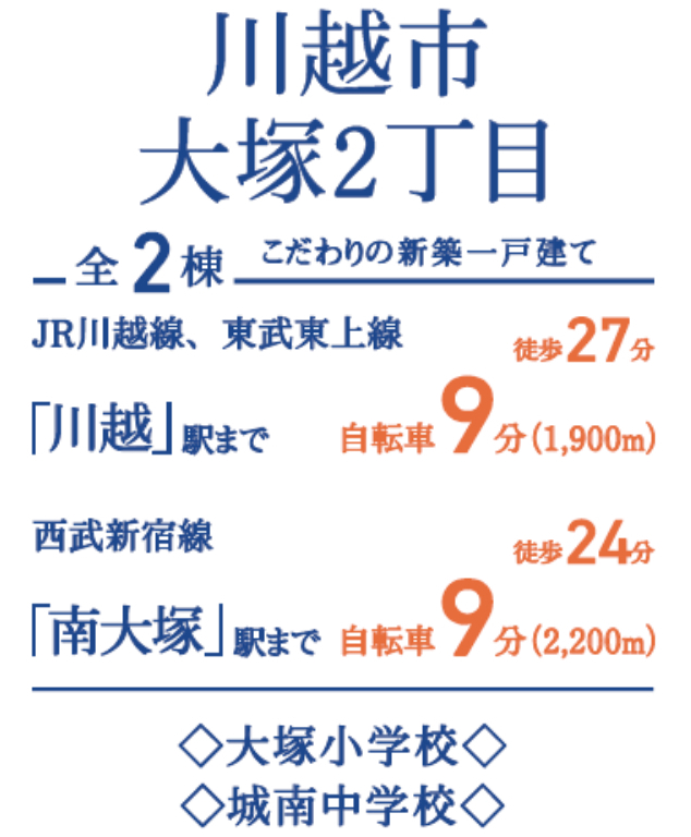 【1号棟】 ☆ブルーミングガーデン川越市大塚2丁目 新築一戸建て 全2棟現場 ★新築仲介手数料無料! ☆東武東上線『川越駅』徒歩27分! ☆西武新宿線『南大塚駅』徒歩24分! ☆敷地面積49坪! ☆お部屋全体が見渡せる対面キッチン付きのリビング! ☆2階10.25帖洋室はライフスタイルに合わせて2部屋に間仕切り可能です! ☆食器洗浄乾燥機、浴室換気乾燥機、24時間換気システム、折り上げ天井、フルオープンキッチン、TVモニター付きインターホンなどの設備です! ☆駐車場2台! ☆川越市立大塚小学校まで徒歩2分、城南中学校まで徒歩19分の通学距離です! ☆長期優良住宅! ☆住宅性能評価書取得! ☆フラット35S利用可! ☆省エネBELS対象! ☆耐震+制震等級3の地震に強い家! ☆公営水道、本下水、都市ガス ☆南双葉幼稚園(約396m)、大空保育園(約738m)、ベルク川越むさし野店(約302m)、ファミリーマート小坂旭町店(約537m)、ウエルシア川越新宿店(約542m)、川越旭町郵便局(約269m)、川越あさひクリニック(約376m)、旭町第二公園(約270m) ※現地販売業者さんは売主ではございません。アンケート等の手続きをされますと当社での物件紹介(仲介料手数料無料)が出来なくなります。ご内覧を希望のお客様は当社にて立ち合い・ご案約をさせて頂きますのでお手数ですがTEL049-285-6300までお電話下さい。急いで現地へ向かいますので御連絡お待ちしております。 |