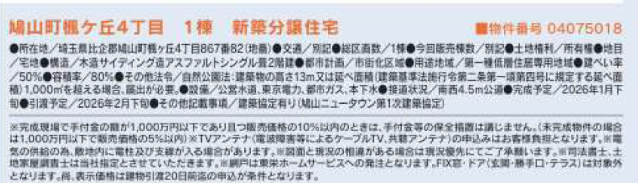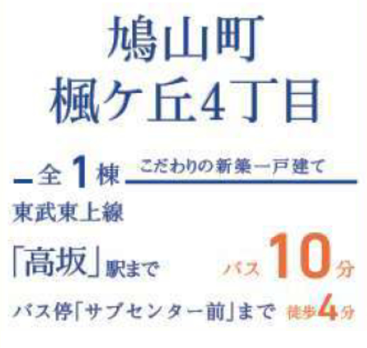 ☆比企郡鳩山町楓ヶ丘4丁目 新築一戸建て ※本物件は現在仲介手数料無料でのご紹介はできません。 ☆東武東上線『高坂駅』バス10分、バス停『サブセンター前』停歩4分! ☆敷地面積62坪! ☆折り上げ天井になっていて開放感のあるリビング! ☆2部屋から出入り可能な広々したバルコニー! ☆食器洗浄乾燥機、浴室換気乾燥機、24時間換気システム、フルオープンキッチン、TVモニター付きインターホン、システムバス、節水型トイレ、ハンドシャワー付き洗面化粧台、LED照明などの設備です! ☆駐車場2台! ☆鳩山町立鳩山小学校まで徒歩7分、鳩山中学校まで徒歩39分の通学距離です! ☆長期優良住宅! ☆住宅性能評価書取得! ☆フラット35S利用可! ☆省エネBELS対象! ☆耐震+制震等級3の地震に強い家! ☆公営水道、本下水、都市ガス ☆ひばり保育園(約2709m)、鳩山幼稚園(約3270m)、西友鳩山ニュータウン店(約648m)、ファミリーマート鳩山ニュータウン店(約607m)、ウエルシアにっさい花みず木店(約1715m)、ダイヤモンド公園(約43m) |