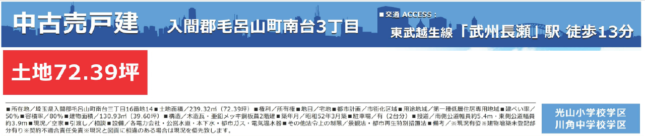 ☆入間郡毛呂山町南台3丁目 中古戸建て ☆東武越生線『武州長瀬駅』徒歩13分! ☆敷地面積72坪! ☆昭和52年3月築、7DK中古住宅です! ☆南・東道路に面した広い敷地の住まい! ☆陽当たり良好です! ☆部屋数が多いので大家族にも最適! ☆駐車場2台! ☆毛呂山町立光山小学校、川角中学校の通学区です ☆公営水道、本下水、都市ガス ☆セブンイレブン毛呂山長瀬店…徒歩12分、ローソン毛呂山葛貫店…徒歩13分、ドラッグセイムス武州長瀬駅前店…徒歩10分、ヤオコー長瀬店…徒歩13分、東和銀行毛呂山長瀬店…徒歩12分、初野医院…徒歩14分 |