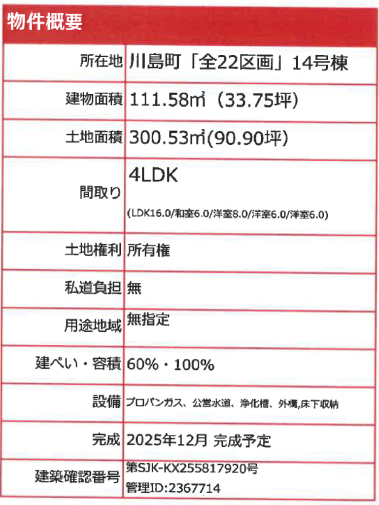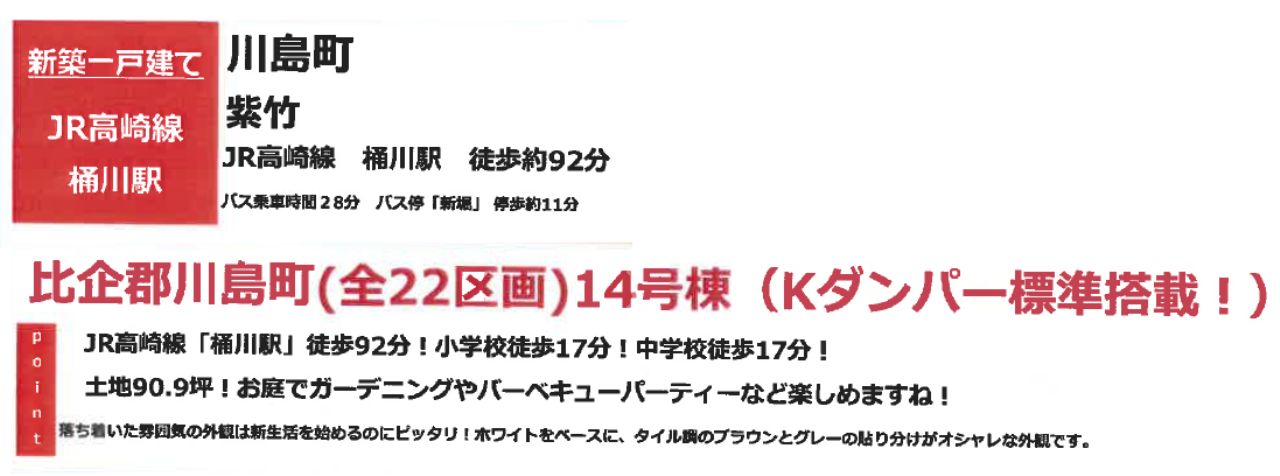 【14号棟】 ☆比企郡川島町紫竹 新築一戸建て 全22棟現場 ★新築仲介手数料無料! ☆西武新宿線『本川越駅』バス21分、バス停『新堀』停歩11分! ☆敷地面積90坪! ☆玄関から階段までリビングを通る動線で家族とコミュニケーションがとりやすい間取り! ☆全室収納スペース付き、6帖以上のお部屋です! ☆駐車場8台! ☆川島町つばさ小学校、川島中学校の通学区です ☆Kダンパー標準搭載! ☆公営水道、浄化槽、プロパンガス ☆ローソン(約780m)、ベイシアフードセンター(約2900m)、川島病院(約2070m) ※現地販売業者さんは売主ではございません。アンケート等の手続きをされますと当社での物件紹介(仲介料手数料無料)が出来なくなります。ご内覧を希望のお客様は当社にて立ち合い・ご案約をさせて頂きますのでお手数ですがTEL049-285-6300までお電話下さい。急いで現地へ向かいますので御連絡お待ちしております。 |