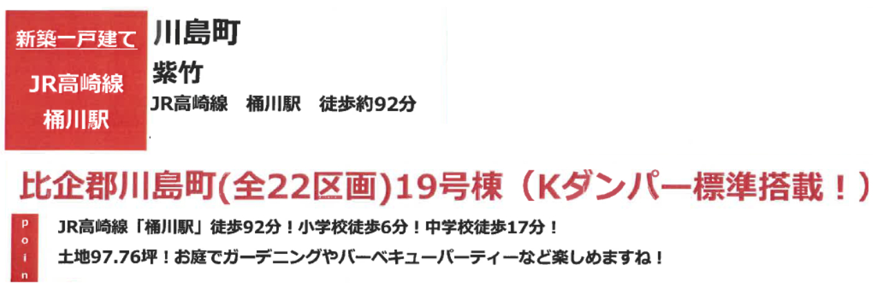 【19号棟】 ☆比企郡川島町紫竹 新築一戸建て 全22棟現場 ★新築仲介手数料無料! ☆西武新宿線『本川越駅』バス21分、バス停『新堀』停歩11分! ☆敷地面積97坪! ☆広々した18帖以上のリビングは開放感があります! ☆ウォークインクローゼットのある主寝室! ☆駐車場8台! ☆川島町つばさ小学校、川島中学校の通学区です ☆Kダンパー標準搭載! ☆公営水道、浄化槽、プロパンガス ☆ローソン(約780m)、ベイシアフードセンター(約2900m)、川島病院(約2070m) ※現地販売業者さんは売主ではございません。アンケート等の手続きをされますと当社での物件紹介(仲介料手数料無料)が出来なくなります。ご内覧を希望のお客様は当社にて立ち合い・ご案約をさせて頂きますのでお手数ですがTEL049-285-6300までお電話下さい。急いで現地へ向かいますので御連絡お待ちしております。 |