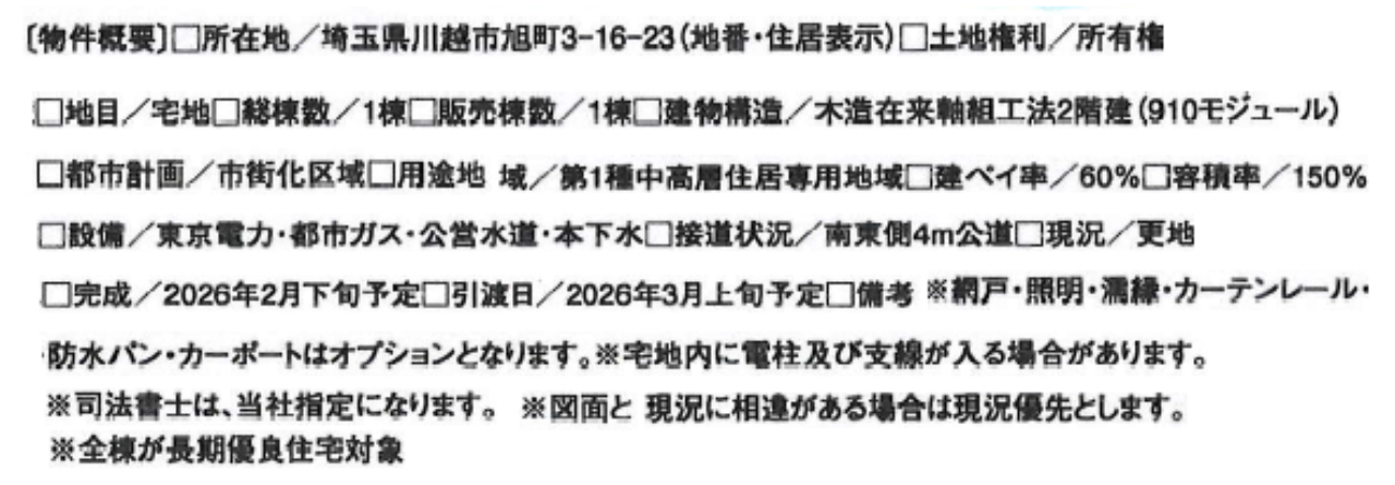 ☆川越市旭町3丁目 新築一戸建て ★新築仲介手数料無料! ☆陽当たり開放感のある二階リビング! ☆陽当たりの良い3階建て住宅! ☆ビルトインガレージ! ☆瑕疵担保保険加入物件! ☆住宅性能評価書取得予定物件! ☆フラット35S利用可! ☆小学校徒歩10分以内 ☆駐車場2台 ☆公営水道、本下水、都市ガス ☆日当り良好! ☆南4m道路! ※現地販売業者さんは売主ではございません。 アンケート等の手続きをされますと当社での物件紹介(仲介料手数料無料)が出来なくなります。ご内覧を希望のお客様は当社にて立ち合い・ご案内をさせて頂きますのでお手数ですがTEL049-285-6300までお電話下さい。急いで現地へ向かいますので御連絡お待ちしております。(^o^) |