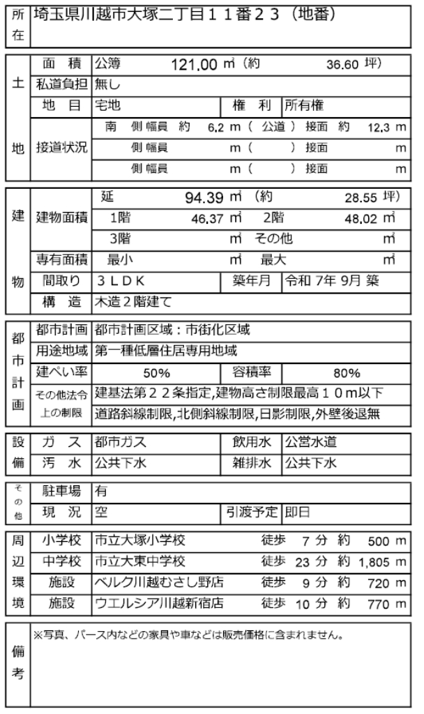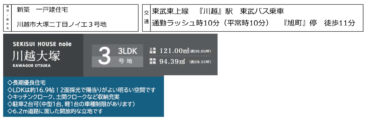 【3号棟】 ☆川越市大塚2丁目ノイエ 新築一戸建て ★新築仲介手数料半額! ☆東武東上線『川越駅』バス10分、バス停『旭町』停歩11分! ☆敷地面積36坪! ☆南道路6.2mにつき陽当たり良好! ☆キッチンクロークやワークスペースを備えたリビング! ☆家族みんなで使えるファミリークロークあり! ☆駐車場2台! ☆川越市立大塚小学校まで徒歩7分、大東中学校まで徒歩23分の通学距離です! ☆長期優良住宅! ☆公営水道、本下水、都市ガス ☆ベルク川越むさし野店…徒歩9分、ウエルシア川越新宿店…徒歩10分 ※現地販売業者さんは売主ではございません。アンケート等の手続きをされますと当社での物件紹介(仲介料手数料無料)が出来なくなります。ご内覧を希望のお客様は当社にて立ち合い・ご案約をさせて頂きますのでお手数ですがTEL049-285-6300までお電話下さい。急いで現地へ向かいますので御連絡お待ちしております。 |