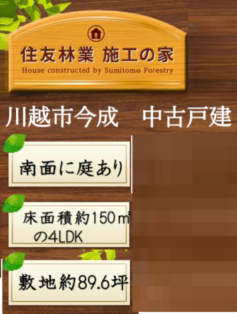 ☆川越市今成1丁目 中古一戸建て ☆敷地89坪! ☆住友林業施工の注文住宅! ☆南には広いお庭付き! ☆延床面積45坪の広いお家です! ☆公営水道、本下水、都市ガス ☆駐車場 ☆日当り良好! |