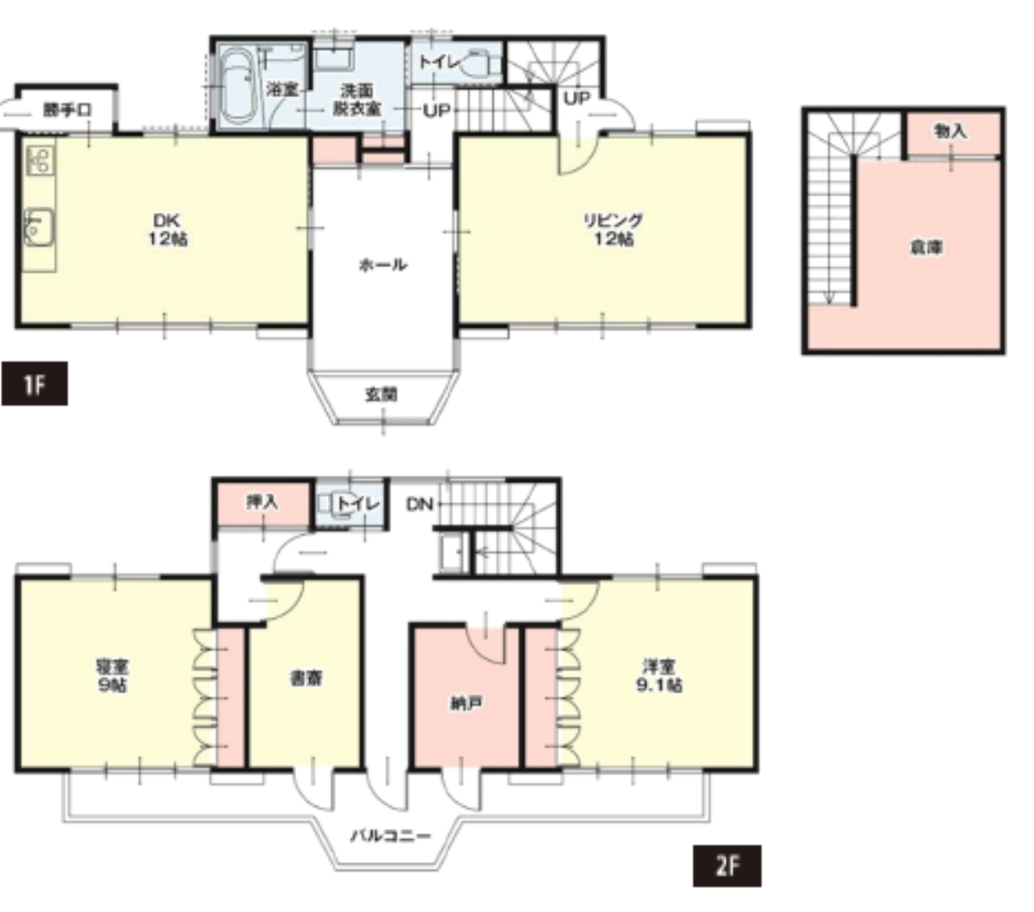 (B1F)倉庫、(1F)DK12、(1F)L12、(2F)洋9、(2F)洋9.1、(2F)書斎、(2F)納戸 |