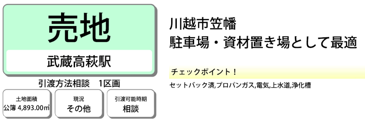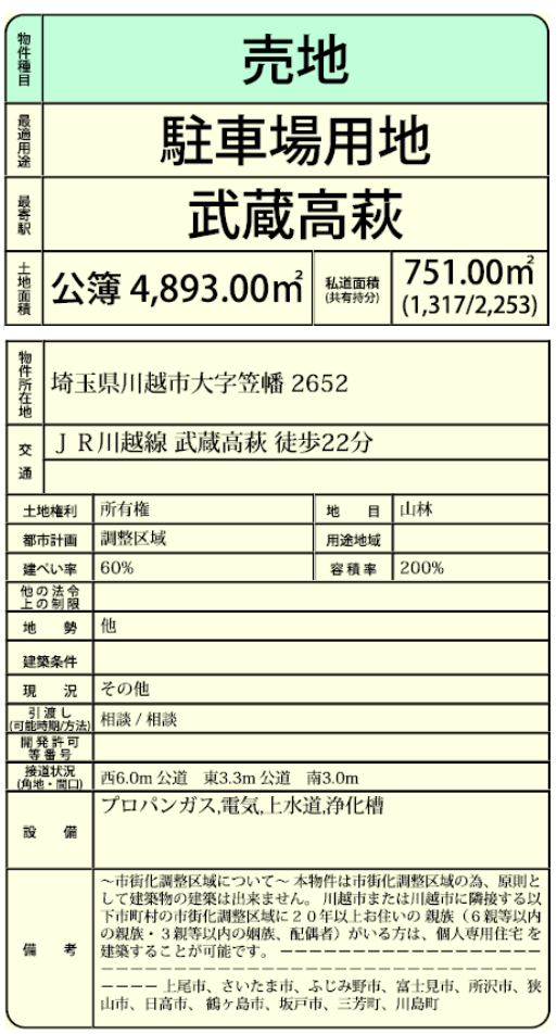☆土地面積1480坪! ☆建築条件無し! ☆とても広い敷地で駐車場や資材置き場としての利用に最適! ☆公営水道、浄化槽、プロパンガス ☆34条12号許可を要す土地の為建築許可制限があります。 |