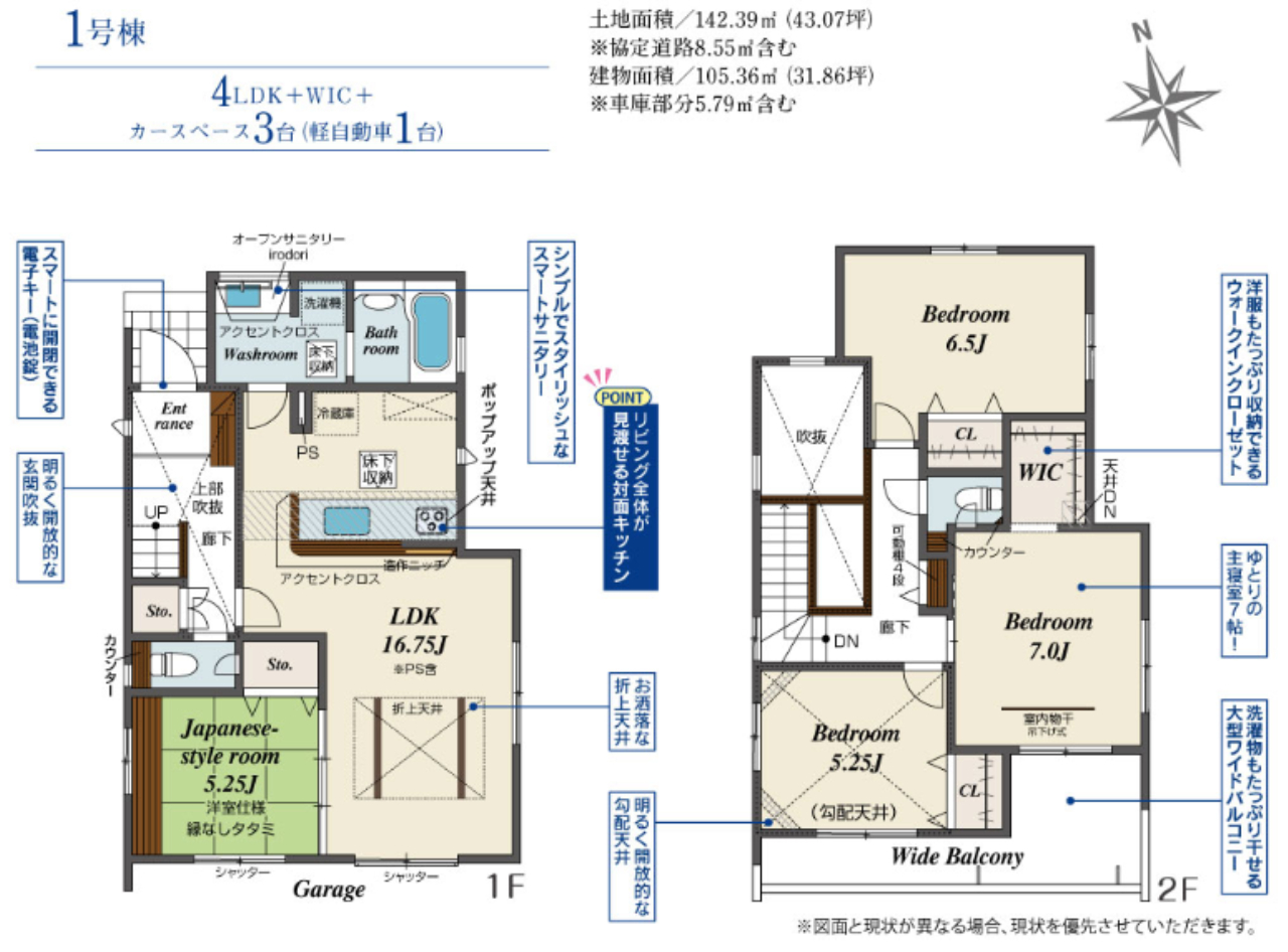 【1号棟】 ☆川越市今成2丁目 新築一戸建て 全3棟現場 ★新築仲介手数料無料! ☆JR川越線『西川越駅』徒歩18分! ☆東武東上線『川越市駅』徒歩22分! ☆敷地面積43坪! ☆折り上げ天井で開放感があるリビング! ☆主寝室にはウォークインクローゼットがあり衣類や荷物が収納できます! ☆駐車場3台! ☆長期優良住宅! ☆住宅性能評価書取得! ☆BELS省エネ! ☆耐震+制震等級3! ☆対面キッチン、食器洗浄乾燥機、24時間換気システム、テレビモニター付きインターホン、浴室乾燥機、温水洗浄便座、ユニットバスなどの設備です! ☆川越市立今成小学校まで徒歩9分、富士見中学校まで徒歩24分の通学距離です! ☆公営水道、本下水、都市ガス ☆第二ひつじ幼稚園(約230m)、今成保育園(約80m)、エコスTAIRAYA月吉店(約500m)、生鮮市場TOP川越店(約1370m)、マミーマート神明町店(約1630m)、スーパービバホーム西川越店(約1070m)、セブンイレブン川越今成店(約580m)、ドラッグセイムス月吉店(約380m)、ウエルシア川越今成店(約590m)、西武本川越PePe(約1800m)、宮沢クリニック(約510m) |
