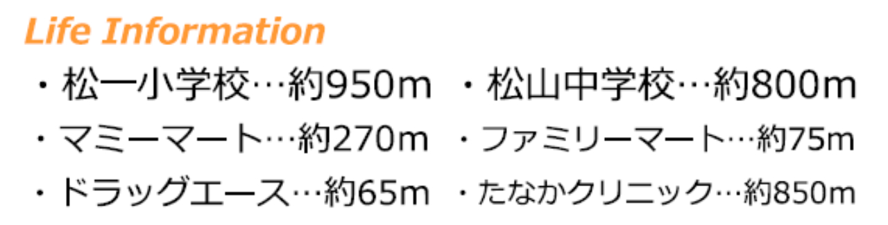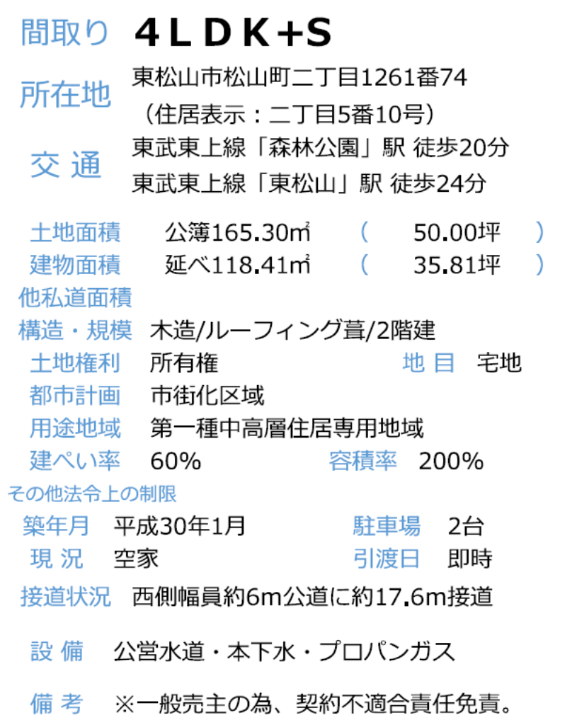 ☆東松山市松山町2丁目 中古戸建て ☆東武東上線『森林公園駅』徒歩20分、『東松山駅』徒歩24分! ☆敷地面積50坪! ☆周辺にはスーパーやコンビニ、ドラッグストアなど生活に便利な施設多数あり! ☆平成30年1月築、築浅の4LDK+納戸付きの中古住宅です! ☆畳表替え、室内クリーニング済み! ☆広々したリビングと全居室6帖以上でゆとりのある家! ☆東松山市立第一小学校まで徒歩12分、松山中学校まで徒歩10分の通学距離です! ☆駐車場2台 ☆前面道路6m! ☆公営水道、本下水、プロパンガス ☆マミーマート(約270m)、ファミリーマート(約75m)、ドラッグエース(約65m)、たなかクリニック(約850m) |