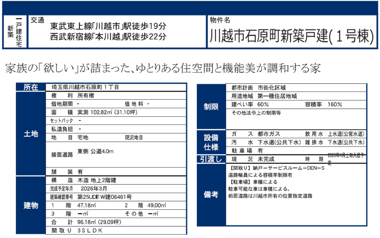 【1号棟】 ☆川越市石原町1丁目 新築一戸建て 全2棟現場 ※本物件は現在仲介手数料無料でのご紹介はできません。 ☆東武東上線『川越市駅』徒歩19分! ☆西武新宿線『本川越駅』徒歩22分! ☆敷地面積31坪! ☆大容量のウォークインクローゼットや対面キッチンのあるリビング! ☆テレワークルームとしても使用できる納戸あり! ☆浴室乾燥機、浄水器、カウンターキッチン、24時間換気システム、温水洗浄便座などの設備です! ☆駐車場2台! ☆川越市立高階小学校、寺尾中学校の通学区です ☆公営水道、本下水、都市ガス ☆TAIRAYA月吉店…徒歩8分、マミーマート神明町店…徒歩13分、ウエルシア川越今成店…徒歩2分、ローソン川越石原町店…徒歩2分 |