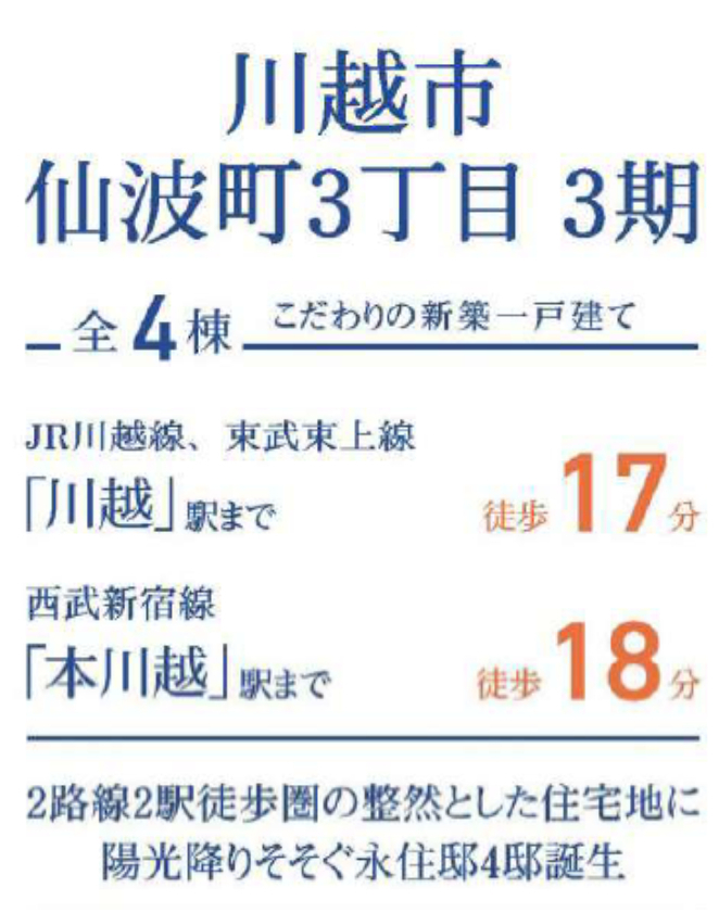 【4号棟】 ☆ブルーミングガーデン川越市仙波町3丁目3期 新築一戸建て 全4棟現場 ★新築仲介手数料無料! ☆東武東上線『川越駅』徒歩17分! ☆西武新宿線『本川越駅』徒歩18分! ☆敷地面積34坪! ☆お部屋全体が見渡せる対面キッチン付きのリビング! ☆2階10.5帖の洋室は間仕切り可能で4LDKとしても使用できる間取り! ☆浄水器、24時間換気システム、食器洗浄乾燥機、浴室換気乾燥機、断熱仕様玄関ドア、フルオープンキッチン、温水洗浄便座、テレビモニター付きインターホン、ハンドシャワー付き洗面化粧台、LED照明などの設備です! ☆駐車場2台! ☆川越市立第一小学校まで徒歩20分、第一中学校まで徒歩5分の通学距離です! ☆長期優良住宅! ☆住宅性能評価書取得! ☆フラット35S利用可! ☆省エネBELS対象! ☆耐震+制震等級3の地震に強い家! ☆公営水道、本下水、都市ガス ☆ひつじ幼稚園(約110m)、認定こども園あそかこども園(約510m)、ローソン川越仙波町店(約326m)、ウエルシア川越仙波店(約479m)、ベルク川越小仙波店(約552m)、セブンイレブン川越仙波町2丁目店(約573m)、丸広百貨店川越店(約1025m)、川越脇田郵便局(約855m)、市立川越駅東口図書館(約898m) ※現地販売業者さんは売主ではございません。アンケート等の手続きをされますと当社での物件紹介(仲介料手数料無料)が出来なくなります。ご内覧を希望のお客様は当社にて立ち合い・ご案約をさせて頂きますのでお手数ですがTEL049-285-6300までお電話下さい。急いで現地へ向かいますので御連絡お待ちしております。 |