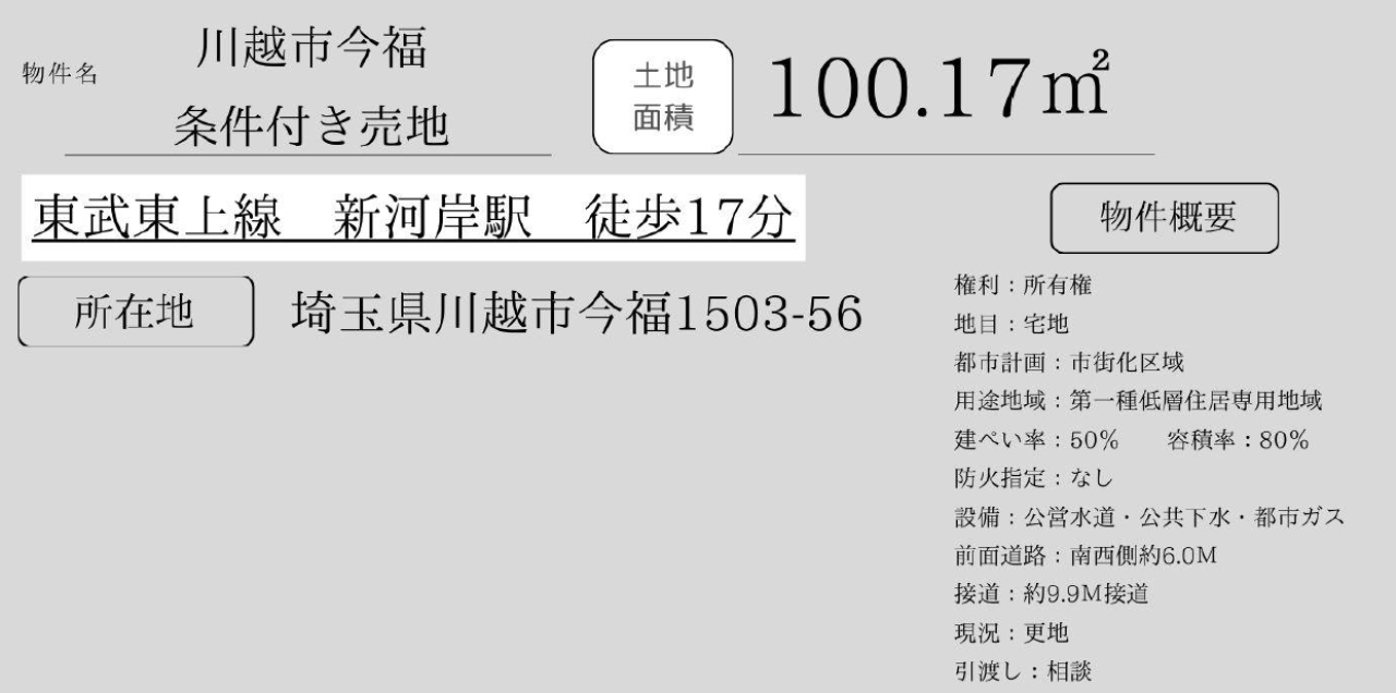 ☆川越市今福 建築条件無し売地 ★仲介手数料無料土地! ☆東武東上線『新河岸駅』徒歩17分! ☆土地面積30坪! ☆建築条件付きの売地です! ☆南西道路につき陽当たり良好です! ☆川越市立高階北小学校まで徒歩5分、高階中学校まで徒歩13分の通学距離です! ☆公営水道、公共本下水、都市ガス ☆どなたでも建築できる土地です!(34条11号適用含む) ☆ファミリーマート川越砂新田店…徒歩6分、生鮮市場高階店…徒歩12分、竹 |