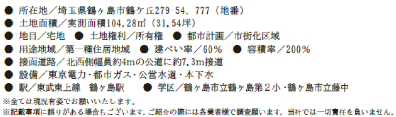 ☆鶴ヶ島市鶴ヶ丘 建築条件無し売地 ☆南西4m道路! ☆公営水道、公共本下水、都市ガス ☆日当り良好! ☆小学校徒歩10分以内! |