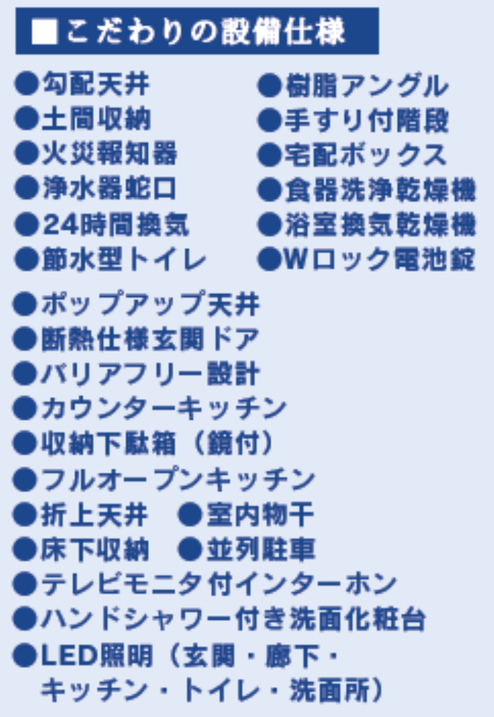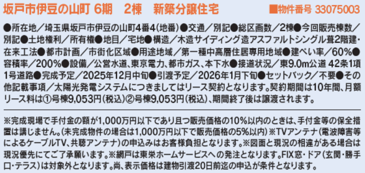 【2号棟】 ☆坂戸市伊豆の山町6期 新築一戸建て 全2棟現場 ★新築仲介手数料0円無料! ☆長期優良住宅! ☆太陽光発電システム搭載新築物件! ☆省エネルギー性能レベル6:★★★★★★ ☆東武東上線『坂戸駅』徒歩11分! ☆開放感のあるフルオープンキッチン付きのリビング! ☆2階洋室は用途に合わせて2部屋に間仕切り可能です! ☆浄水器、温水洗浄便座、玄関断熱ドア、24時間換気システム、網戸、フルオープンキッチン、土間収納、ハンドシャワー付洗面化粧台、ペアガラス、TVモニター付きインターホン、宅配ボックス、食器洗浄乾燥機、浴室暖房乾燥機、LED照明などの設備です! ☆駐車場2台! ☆住宅性能評価書取得! ☆フラット35S利用可! ☆坂戸市立桜小学校、桜中学校まで徒歩5分の通学距離です! ☆公営水道、本下水、都市ガス ☆太陽光発電システムにつきましてはリース契約となります。 契約期間は10年間、月額リース料 ①号棟9, 053円(税込) ②号棟9, 053円(税込) 期間終了後は譲渡されます。 ☆坂戸幼稚園(約1700m)、坂戸さくら保育園(約315m)、ローソン坂戸溝端町店(約260m)、スギドラッグ坂戸店(約444m)、サンディ北坂戸店(約703m)、ヤオコー坂戸泉店(約640m)、溝端公園(約613m)、坂戸市役所北坂戸出張所(約631m)、北坂戸団地内郵便局(約731m) ※現地販売業者さんは売主ではございません。 アンケート等の手続きをされますと当社での物件紹介(仲介料手数料無料)が出来なくなります。ご内覧を希望のお客様は当社にて立ち合い・ご案内をさせて頂きますのでお手数ですがTEL049-285-6300までお電話下さい。急いで現地へ向かいますので御連絡お待ちしております。(^o^) |