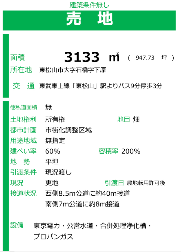 ☆東松山市石橋 建築条件無売り地! ☆東武東上線『東松山駅』バス9分! ☆土地面積947坪! ☆とても広い土地で社会福祉施設や診療所などに最適! ☆陽当たり良好! ☆西×南道路! ☆公営水道、合併浄化槽、プロパンガス ☆34条12号許可を要す土地の為建築許可制限があります。 |