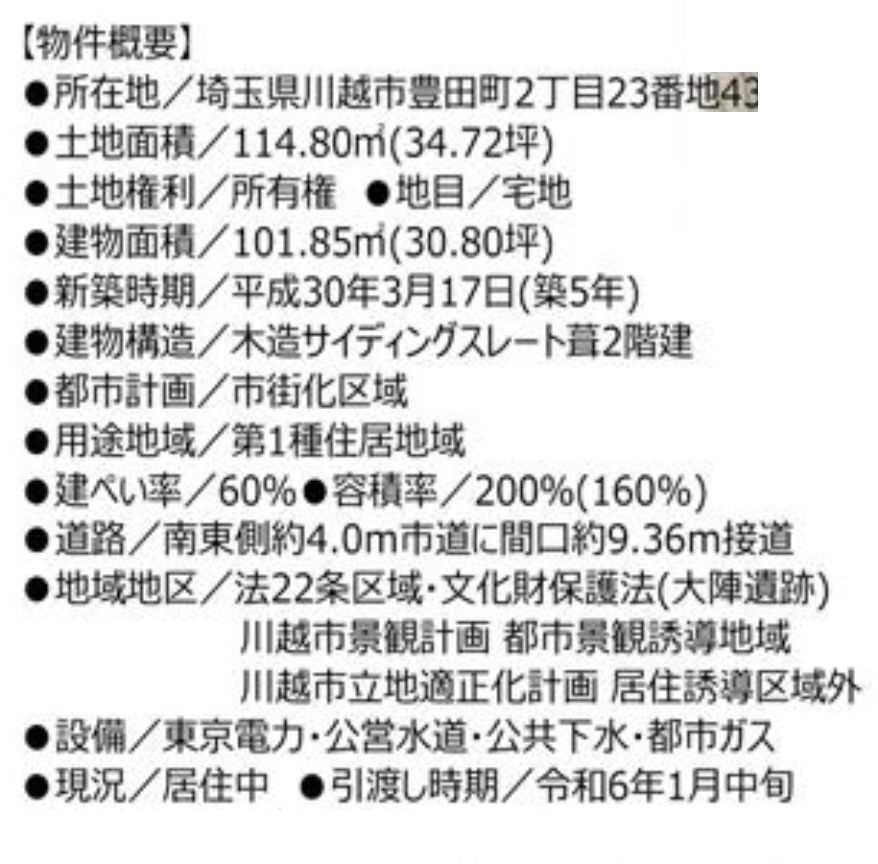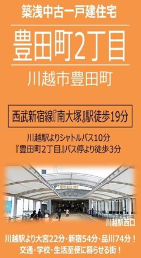 ☆築5年の川越市豊田町 中古一戸建て ☆4mの南東道路で陽当り良好! ☆川越市立大東東小学校まで徒歩13分 ☆大東中学校までは徒歩10分で部活が遅くなっても安心の通学距離です ☆20年間保証のJHS地盤サポートシステム採用! ☆リビングは17帖で人造大理石使用の対面キッチン! ☆基礎構造耐久性・換気性能に優れる基礎パッキン工法の住宅! ☆テレビモニター付インターホン、1階、2階にウォシュレットトイレとキッチン・洗面所に床下収納あり! ☆全居室に収納とウォークインクローゼットや階段上がりのホール収納など収納豊富! ☆駐車場は2台停められます ☆近くにセブンイレブン・コメリ・ニトリ・ガスト・マツモトキヨシなどがあり静かな住宅街です ☆フラット35S利用可! ☆瑕疵担保保険加入物件! ☆公営水道、都市ガス、本下水、東京電力 |