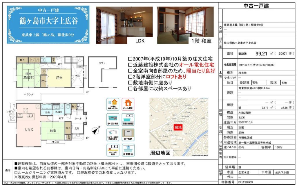 ☆鶴ヶ島市上広谷 中古戸建て ☆東武東上線『鶴ヶ島駅』徒歩9分! ☆敷地面積30坪! ☆平成19年10月築、近藤建設施工の3LDK中古住宅です! ☆火を使わないオール電化住宅です! ☆全室南向きで陽当り良好です! ☆2階洋室部分にロフトが有り荷物の収納や趣味を楽しむスペースとしても使用できます! ☆24時間換気システム、追い焚き機能、浴室乾燥機、シャワー水栓付き洗面化粧台、床下収納などの設備です! ☆お洗濯物がたくさん干せるワイドバルコニー! ☆鶴ヶ島市立杉下小学校、藤中学校の通学区です ☆ルームクリーニング実施済み! ☆公営水道、本下水、オール電化 |