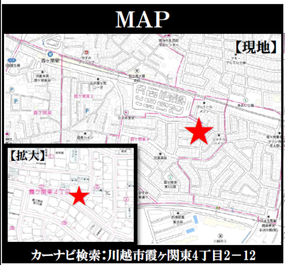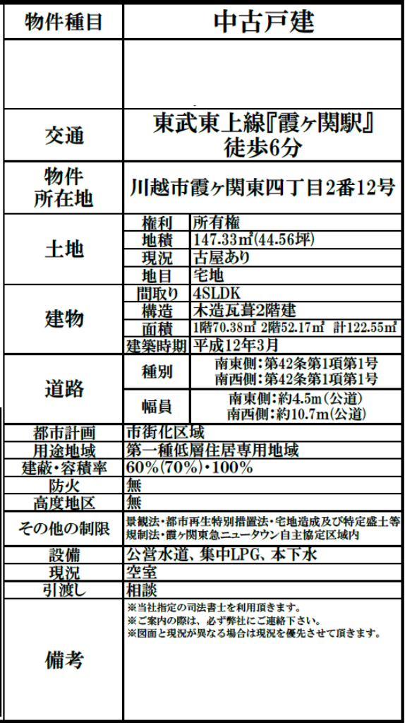☆川越市霞ヶ関東4丁目 中古戸建て ★仲介手数料無料中古一戸建て! ☆東武東上線『霞ヶ関駅』徒歩6分! ☆敷地面積44坪! ☆平成12年3月築、4SLDKの中古住宅です! ☆南東角地で陽当たり良好です! ☆駅まで徒歩6分、通勤通学、お買い物に便利な好立地! ☆駐車場2台! ☆川越市立霞ヶ関東小学校、霞ヶ関東中学校まで徒歩5分の通学距離です! ☆公営水道、本下水、集中プロパンガス ☆霞ヶ関東学童保育園室…徒歩5分、川越白ゆり幼稚園…徒歩9分、アソカマート…徒歩6分、ヤオコー川越霞ヶ関店…徒歩7分、セブンイレブン霞ヶ関駅北口店…徒歩6分、ファミリーマート川越霞ヶ関店…徒歩5分、霞ヶ関東第二公園…徒歩2分、医療法人社団かすみ会…徒歩7分 |