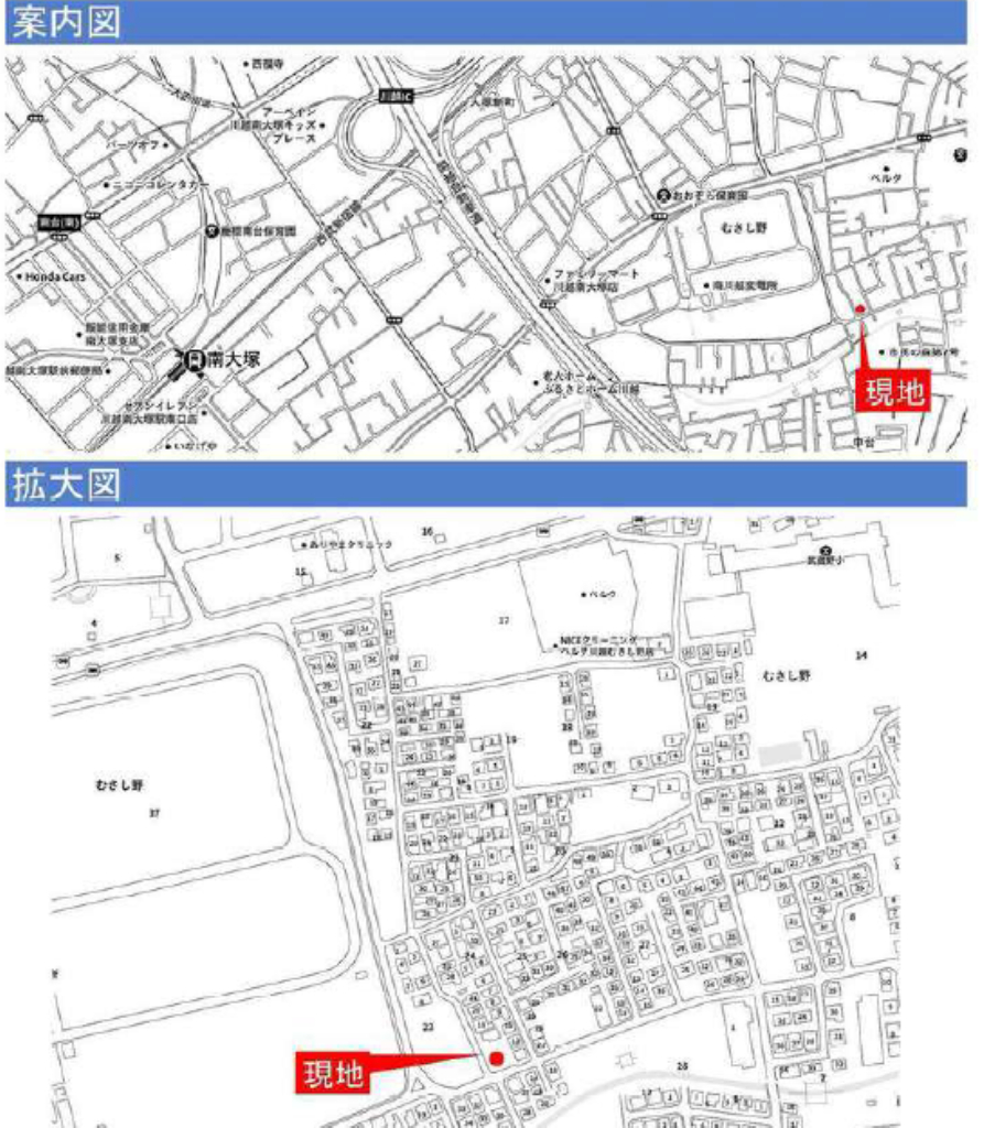 【1区画】 ☆川越市むさし野 建築条件付き売地!全2区画 ☆西武新宿線『南大塚駅』徒歩19分! ☆東武東上線『川越駅』バス9分、バス停『武蔵野小学校』停歩5分! ☆土地面積39坪! ☆建築条件付きの売地です。参考プランもありますのでご相談ください。 ☆南×西道路に面した角地! ☆陽当りも良好! ☆川越市立武蔵野小学校まで徒歩5分、大東中学校まで徒歩23分の通学距離です! ☆公営水道、本下水、都市ガス ☆どなたでも建築できる土地です!(34条11号適用含む) ☆ベルク川越むさし野店(約400m)、セブンイレブン川越今福店(約500m)、ウエルシア川越新宿店(約850m)、ロヂャースマート川越中台店(約1000m)、関本記念病院(約550m)、窪川児童遊園(約130m) |