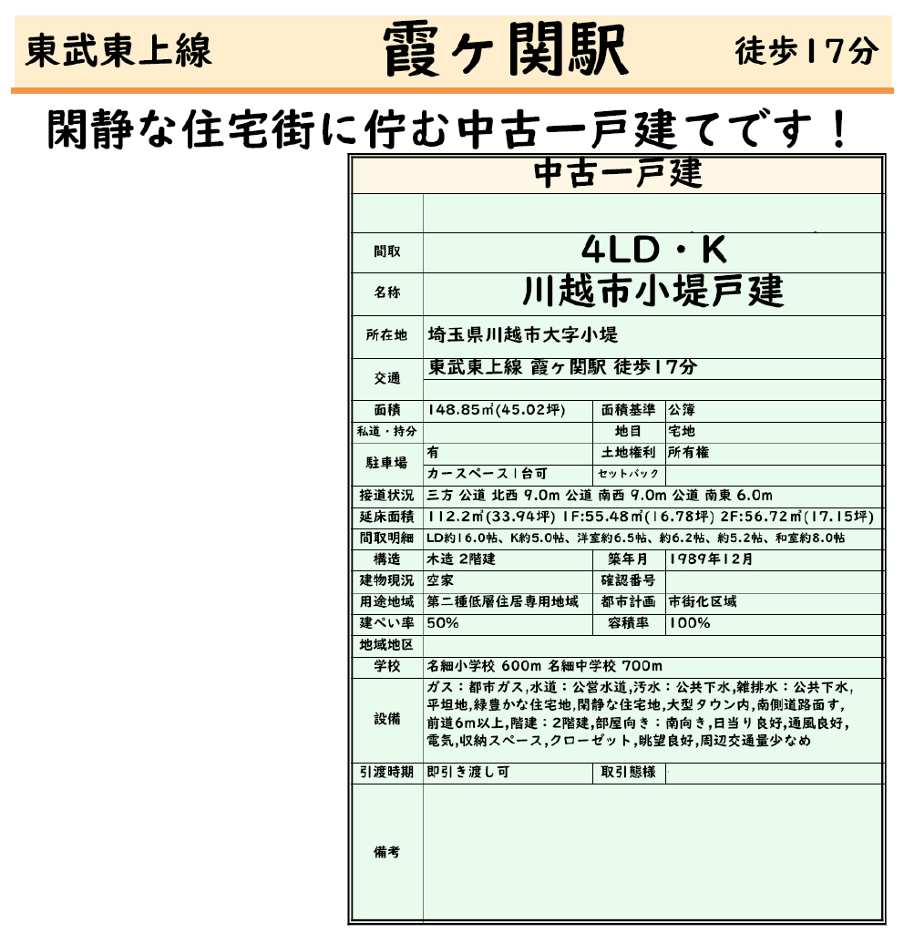 ☆川越市小堤 中古戸建て ☆東武東上線『霞ヶ関駅』17分! ☆敷地面積45坪! ☆平成元年12月築、4LDK中古住宅です! ☆3方面道路で開放感がある角地! ☆閑静な住宅街! ☆駐車場1台! ☆川越立名細小学校まで徒歩7分、名細中学校まで徒歩8分の通学距離です! ☆公営水道、本下水、都市ガス |
